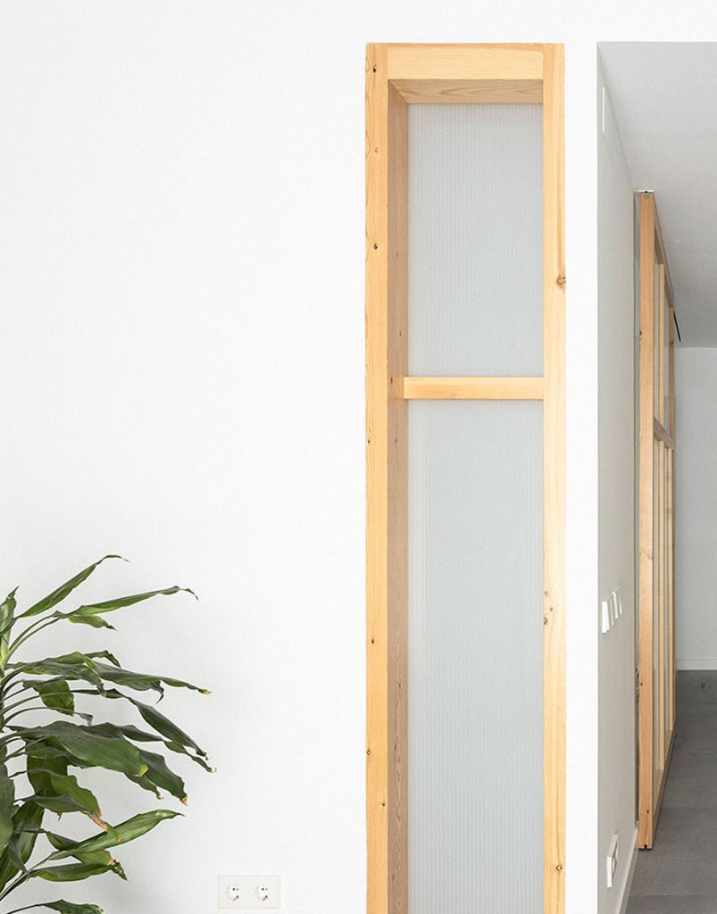 MARINA Conversion of a small studio with terrace into an apartment, reorganizing it using sliding and translucent walls framed in pine wood in order to enhance the brightness of the small space.
