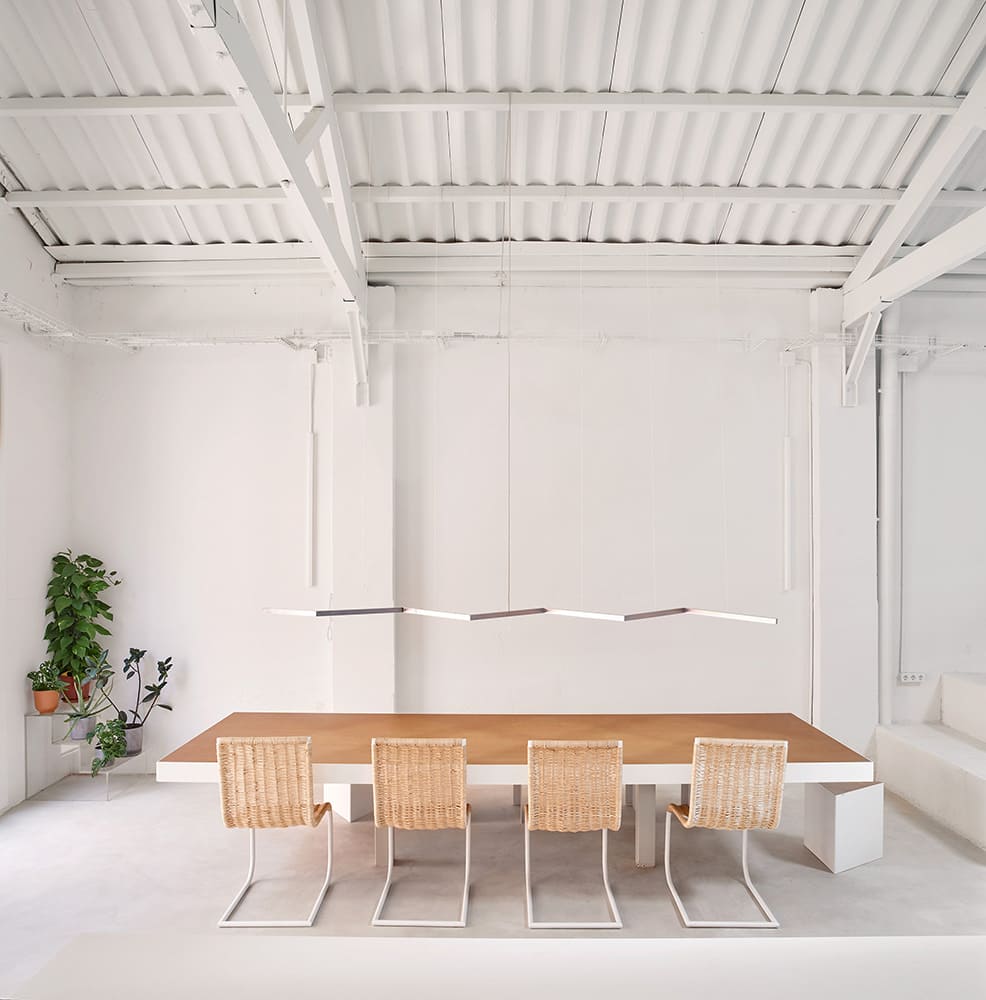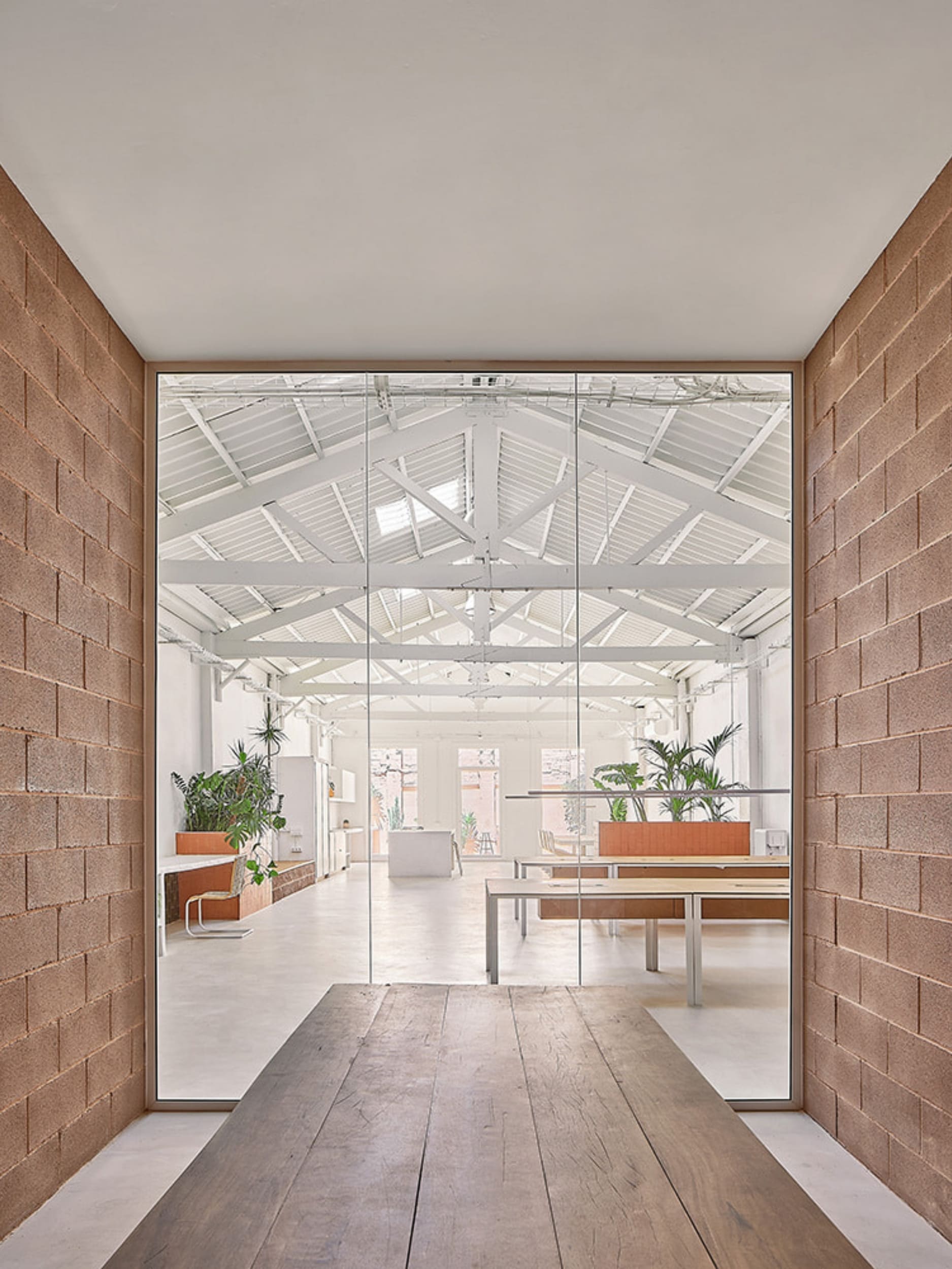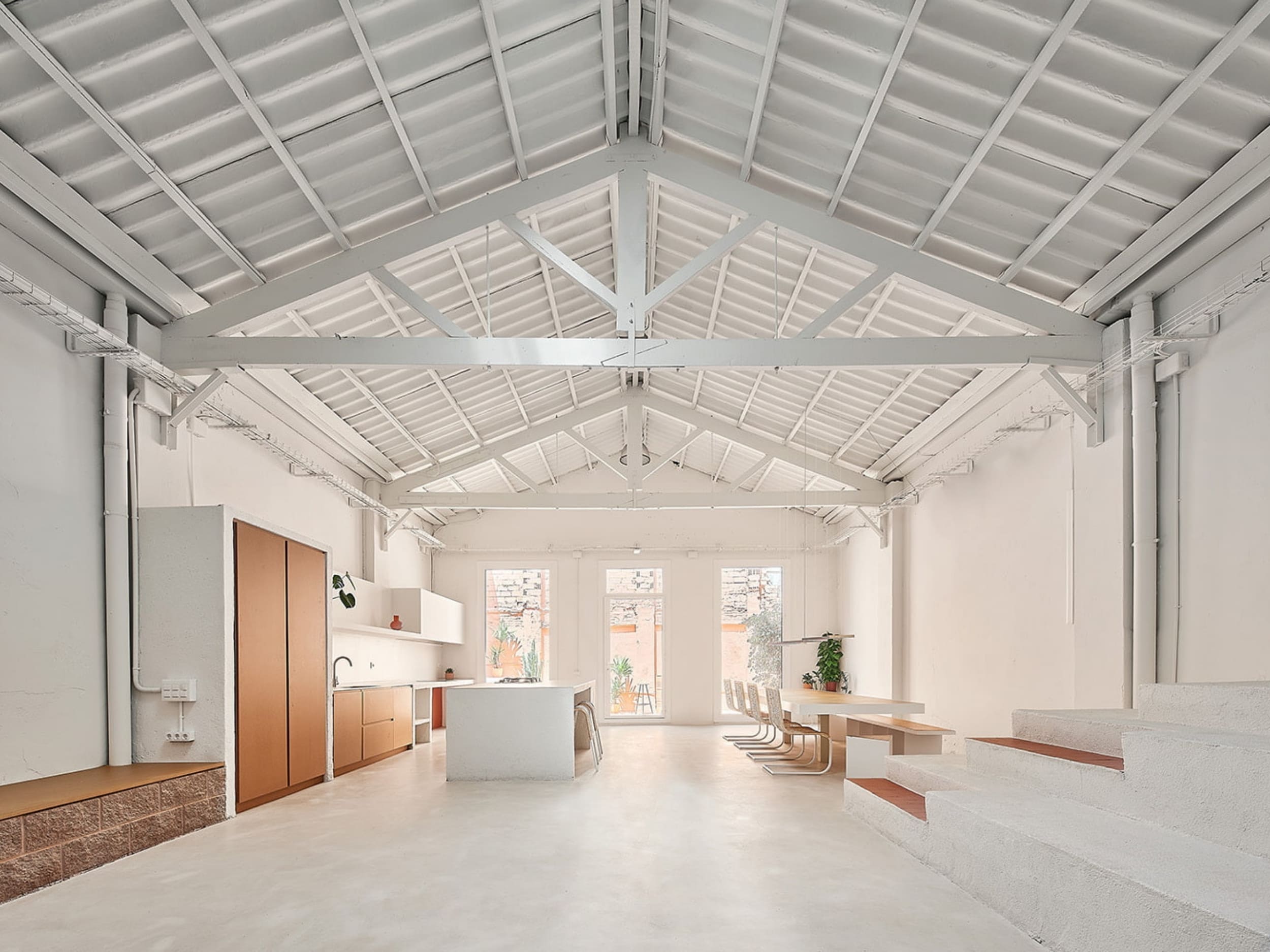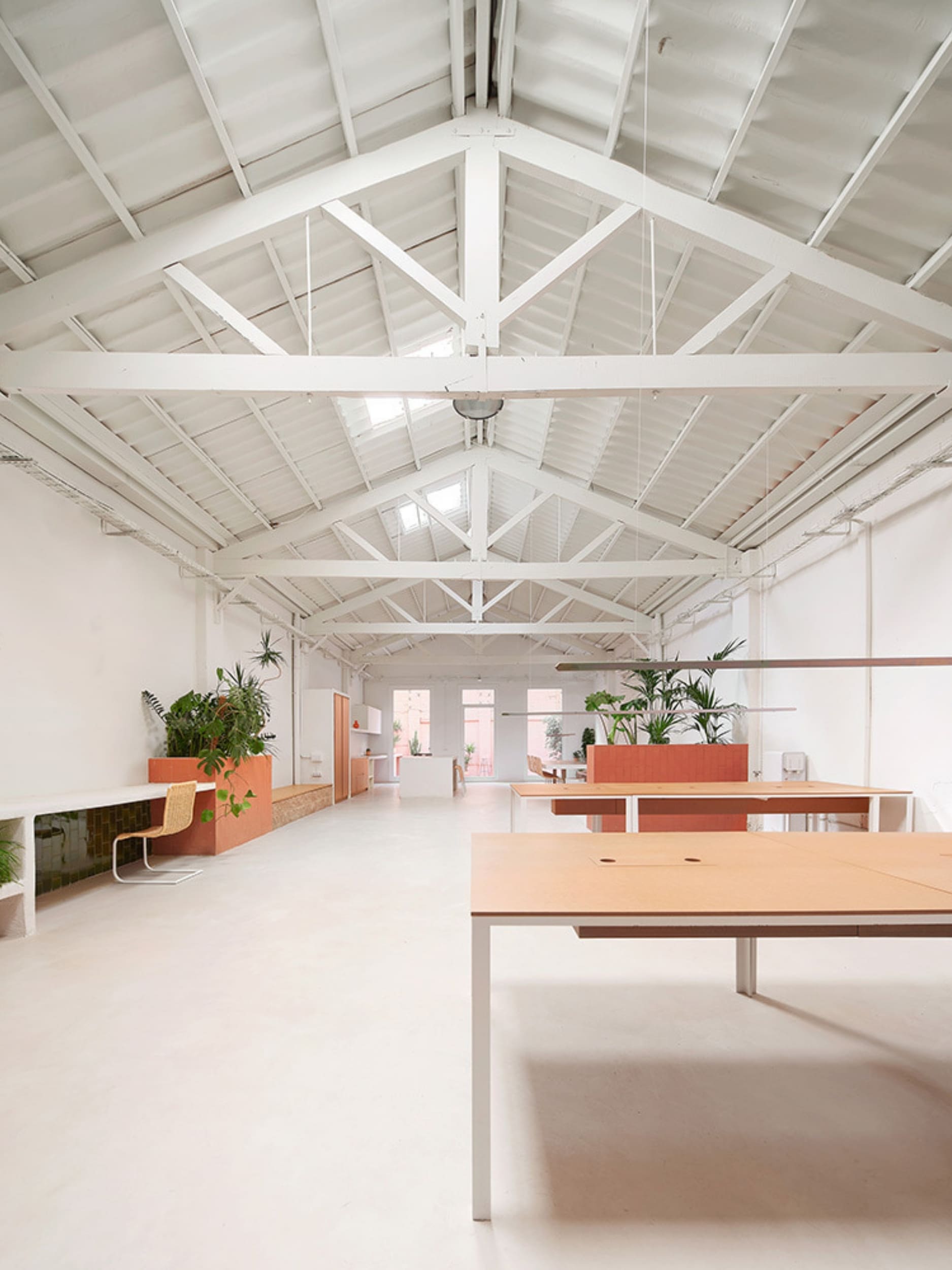 CODEA Reconversion of a store and adjoining warehouse into a multi-purpose office space for a creative agency. A central core for service areas functions as a transition between two large open spaces.