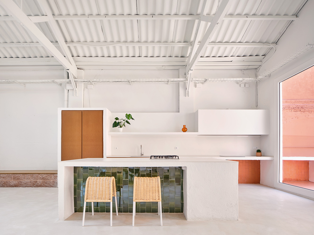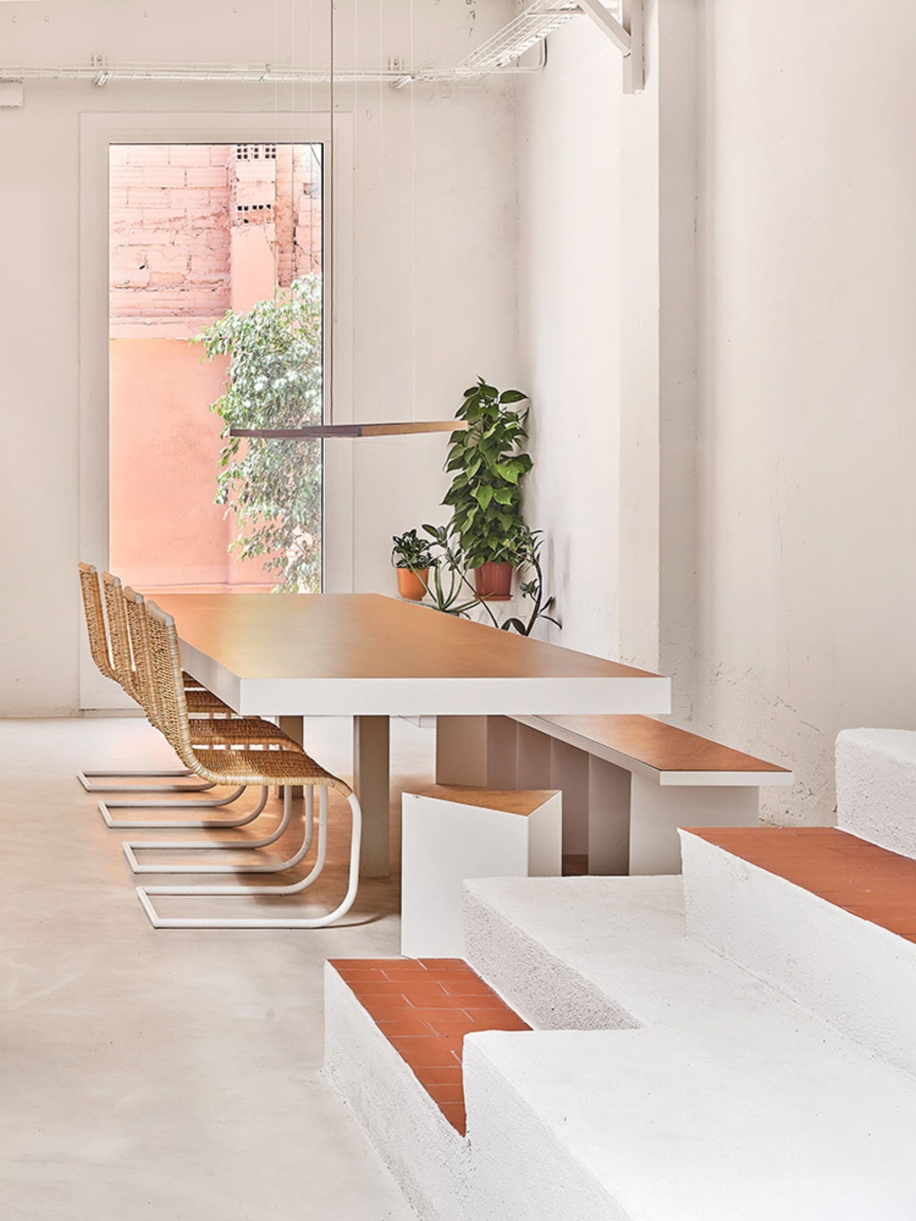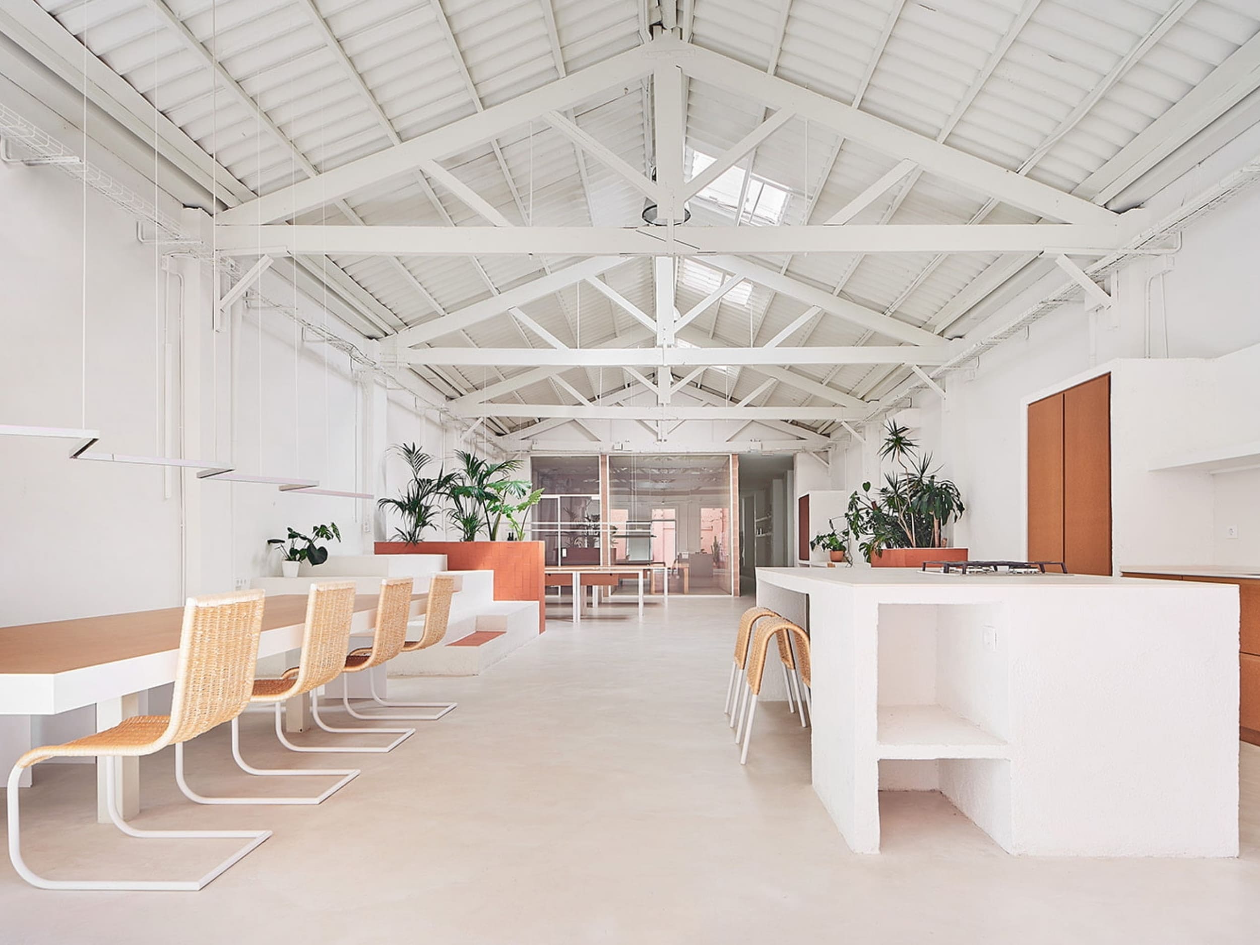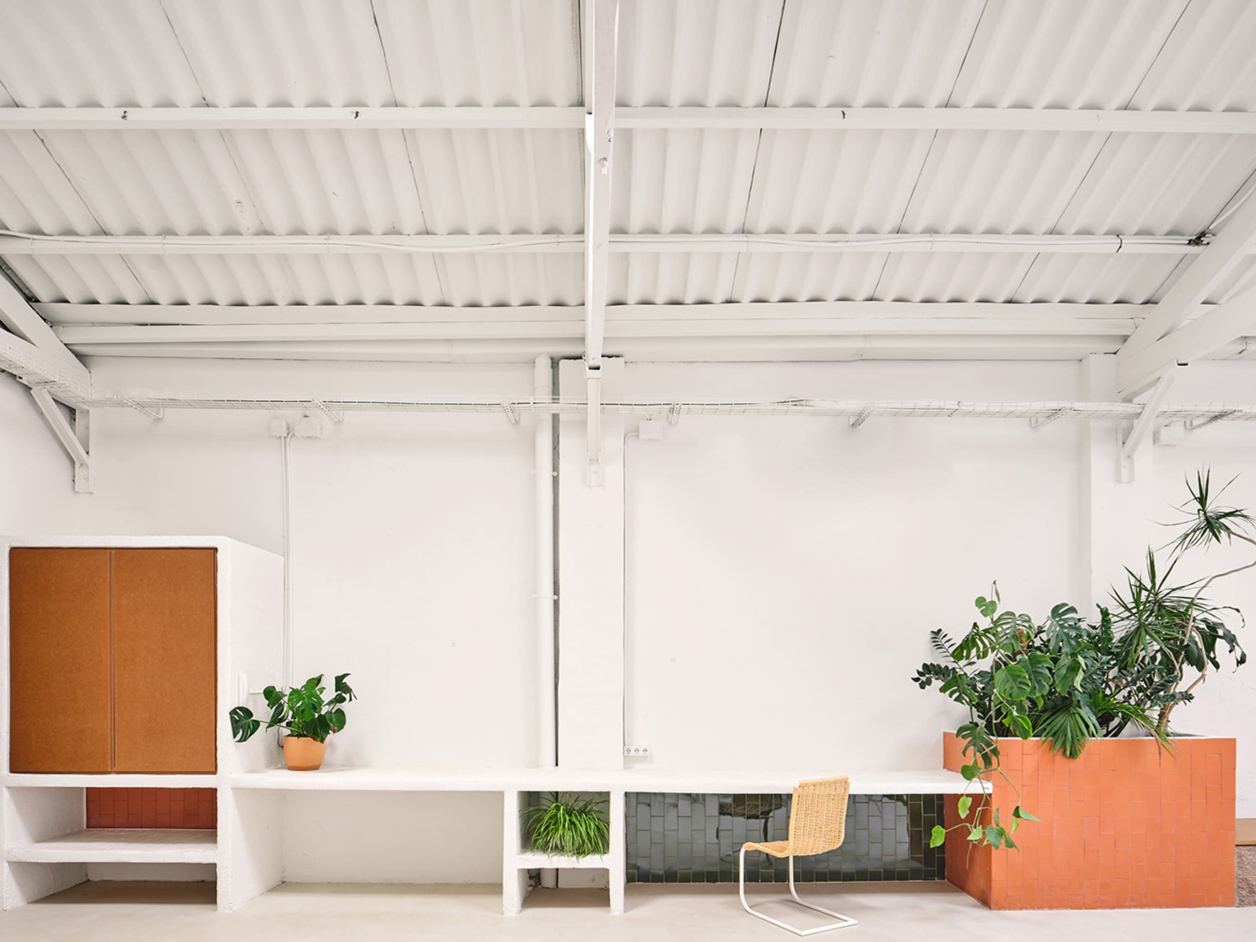 CODEA Reconversion of a store and adjoining warehouse into a multi-purpose office space for a creative agency. A central core for service areas functions as a transition between two large open spaces.