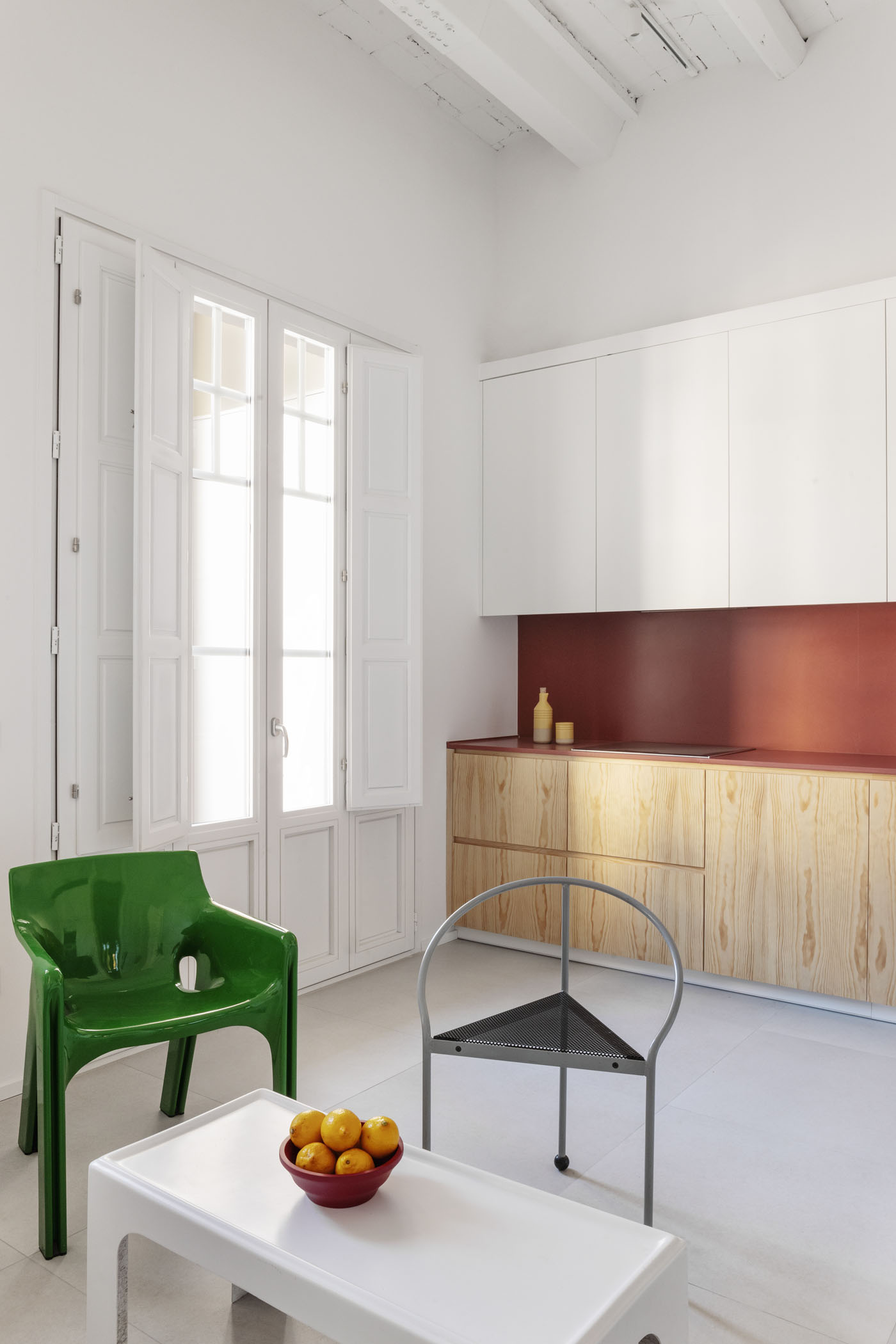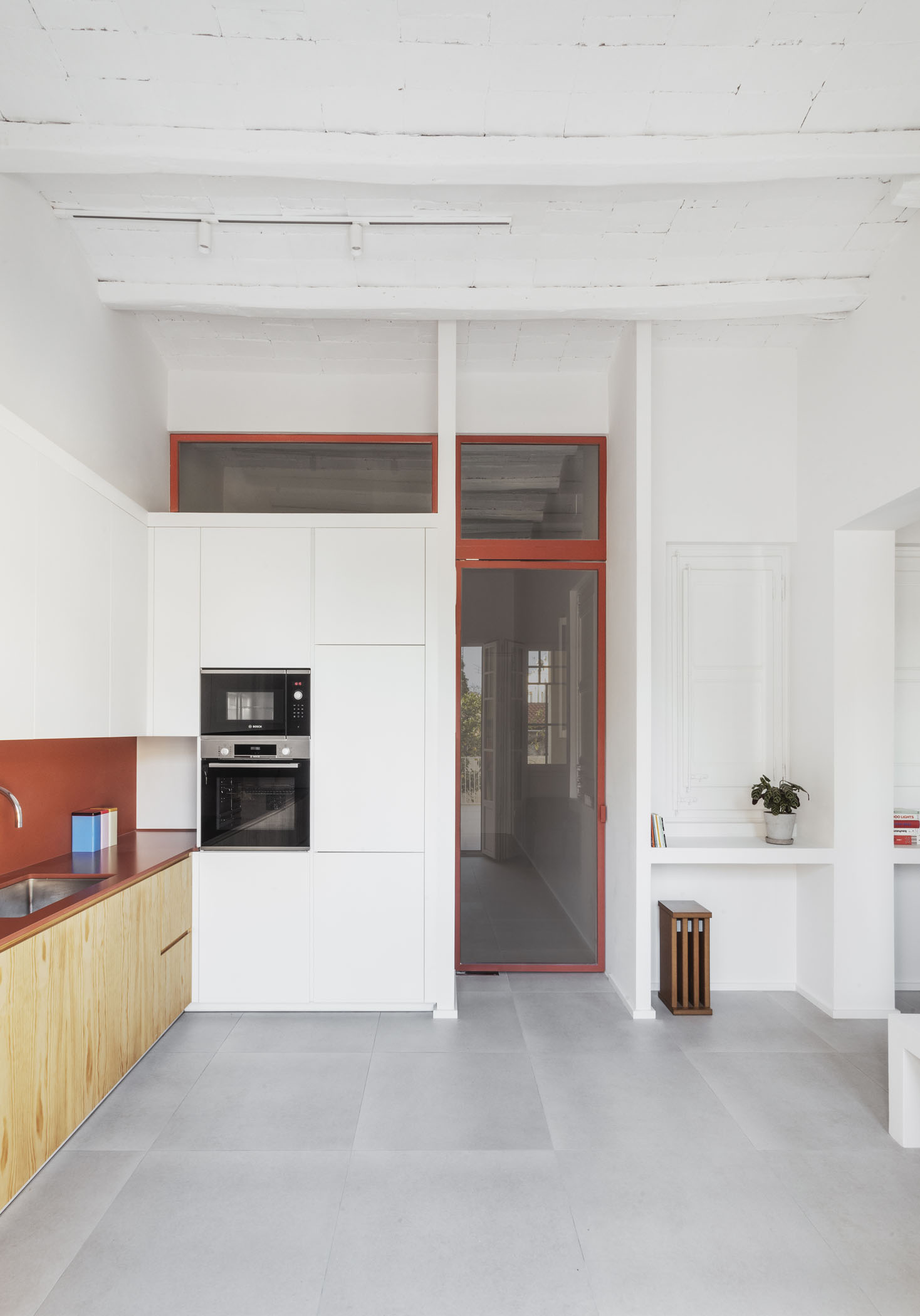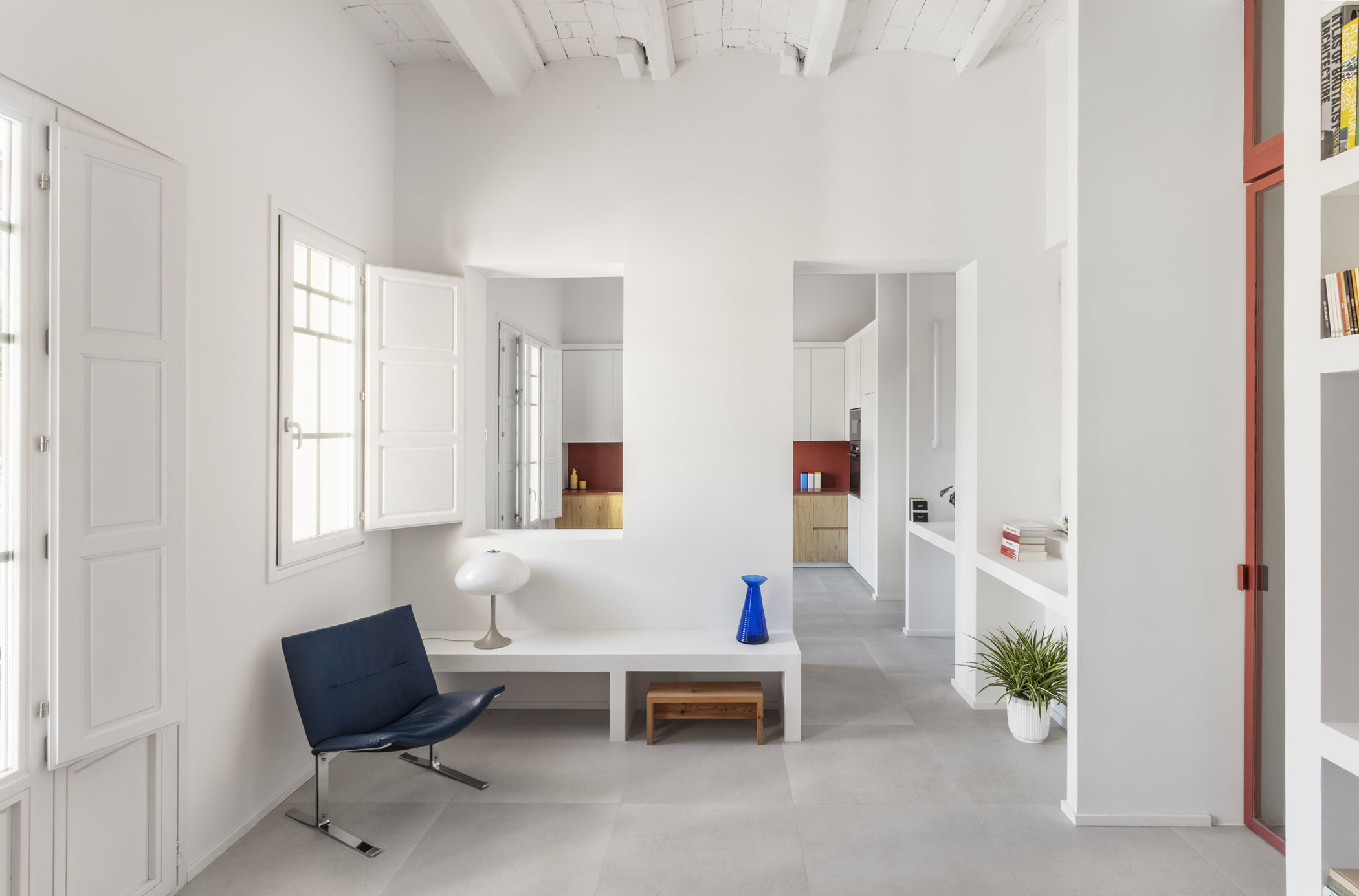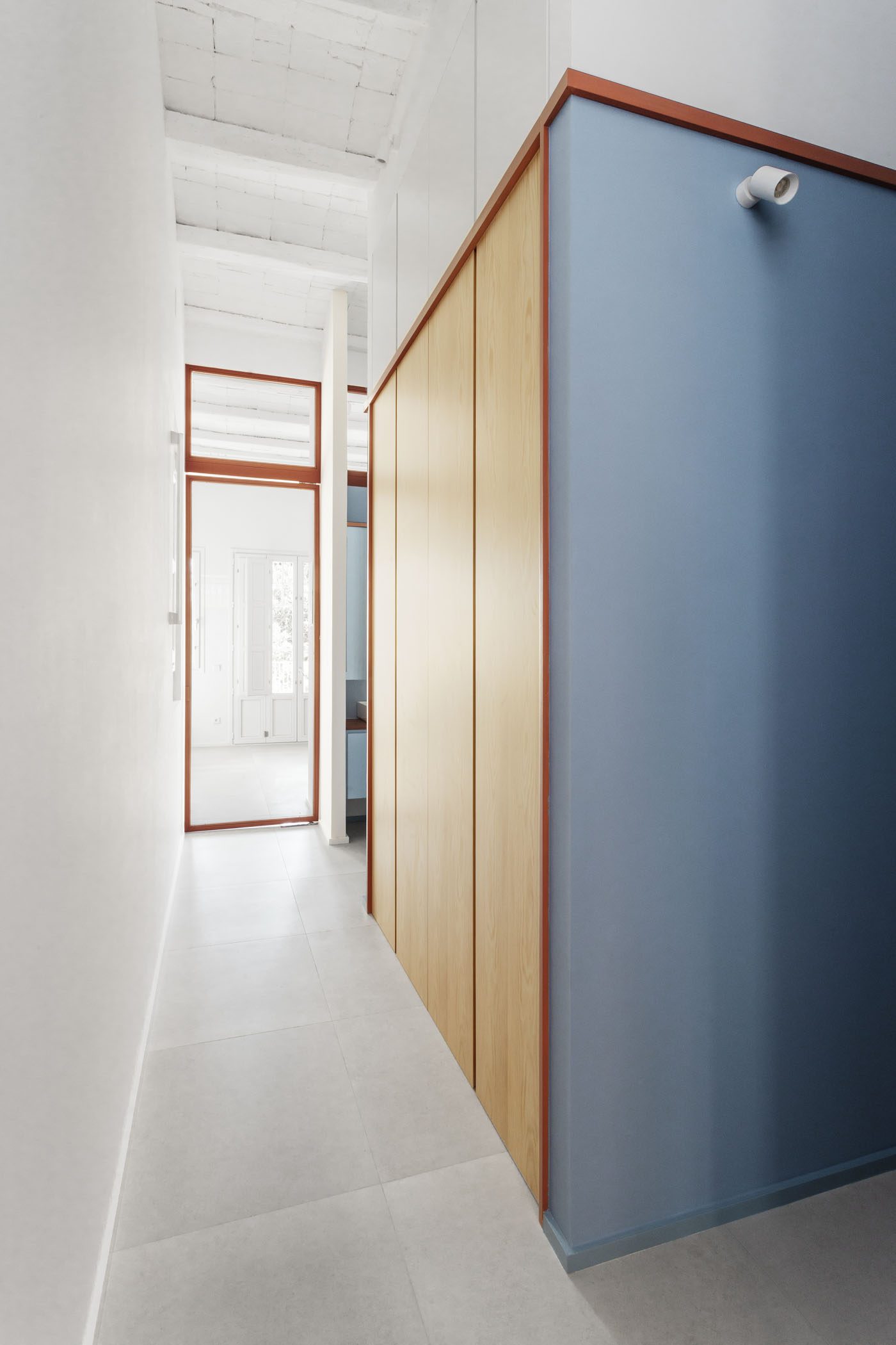 ALT DE MARINER Reconversion of two old commercial premises located on the ground floor of a historical building with a beautiful courtyard into a new house by Horta neighborhood. The main objective of the project is to open up and communicate the spaces and give maximum light to the interior areas. The metallic carpentries and countertops in terracotta color, along with the sky-blue of some walls combined with the pine wood, give personality to this new home.