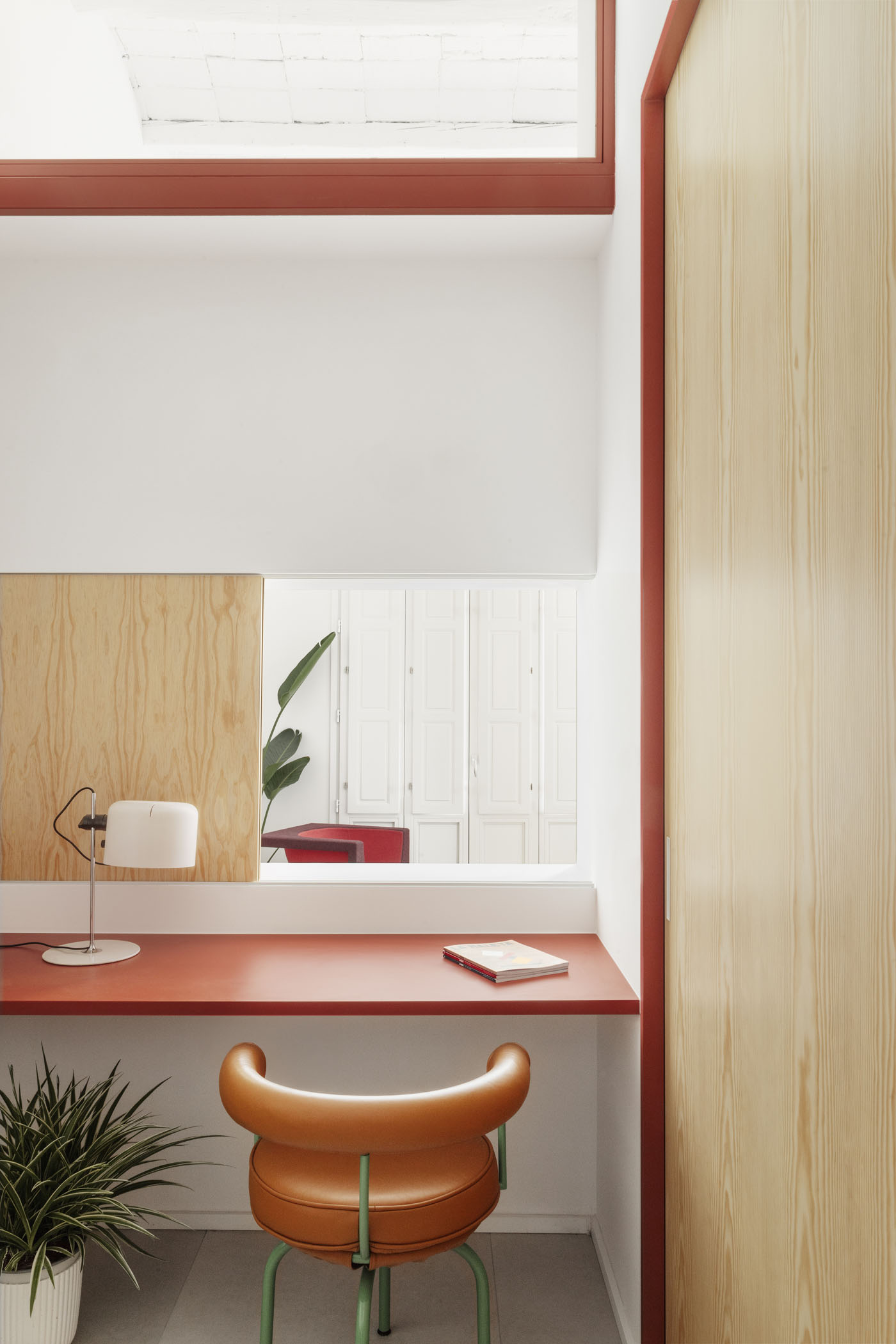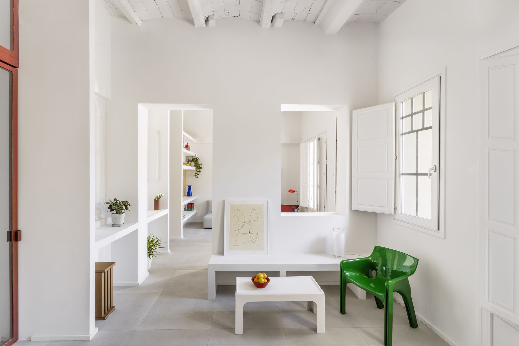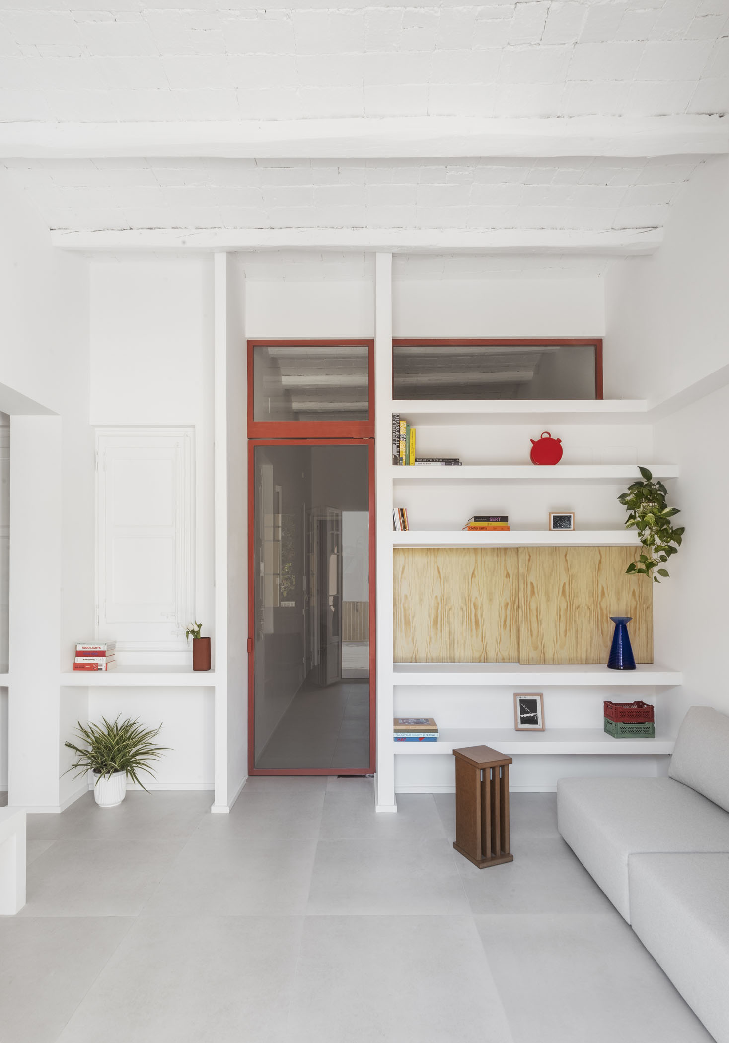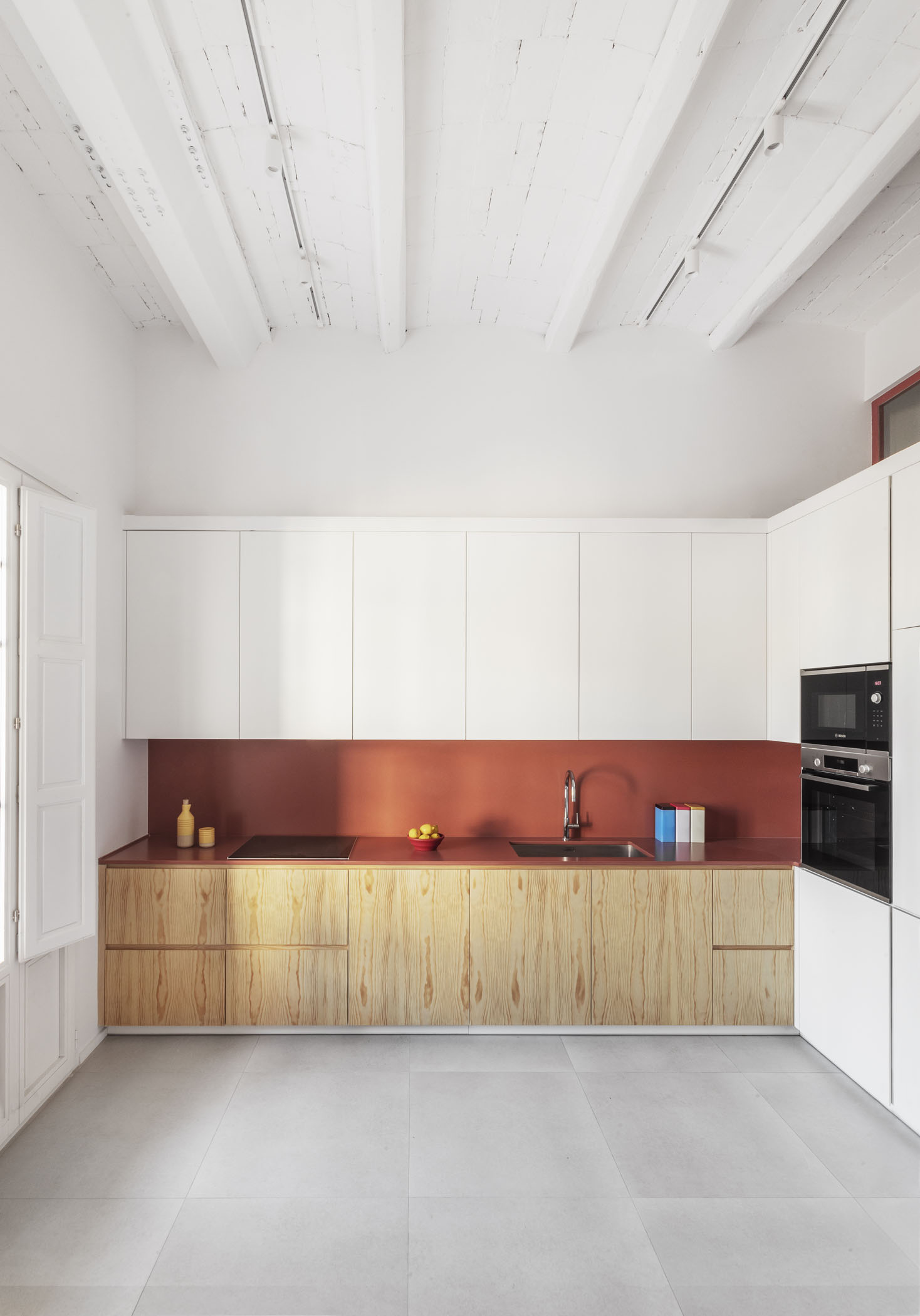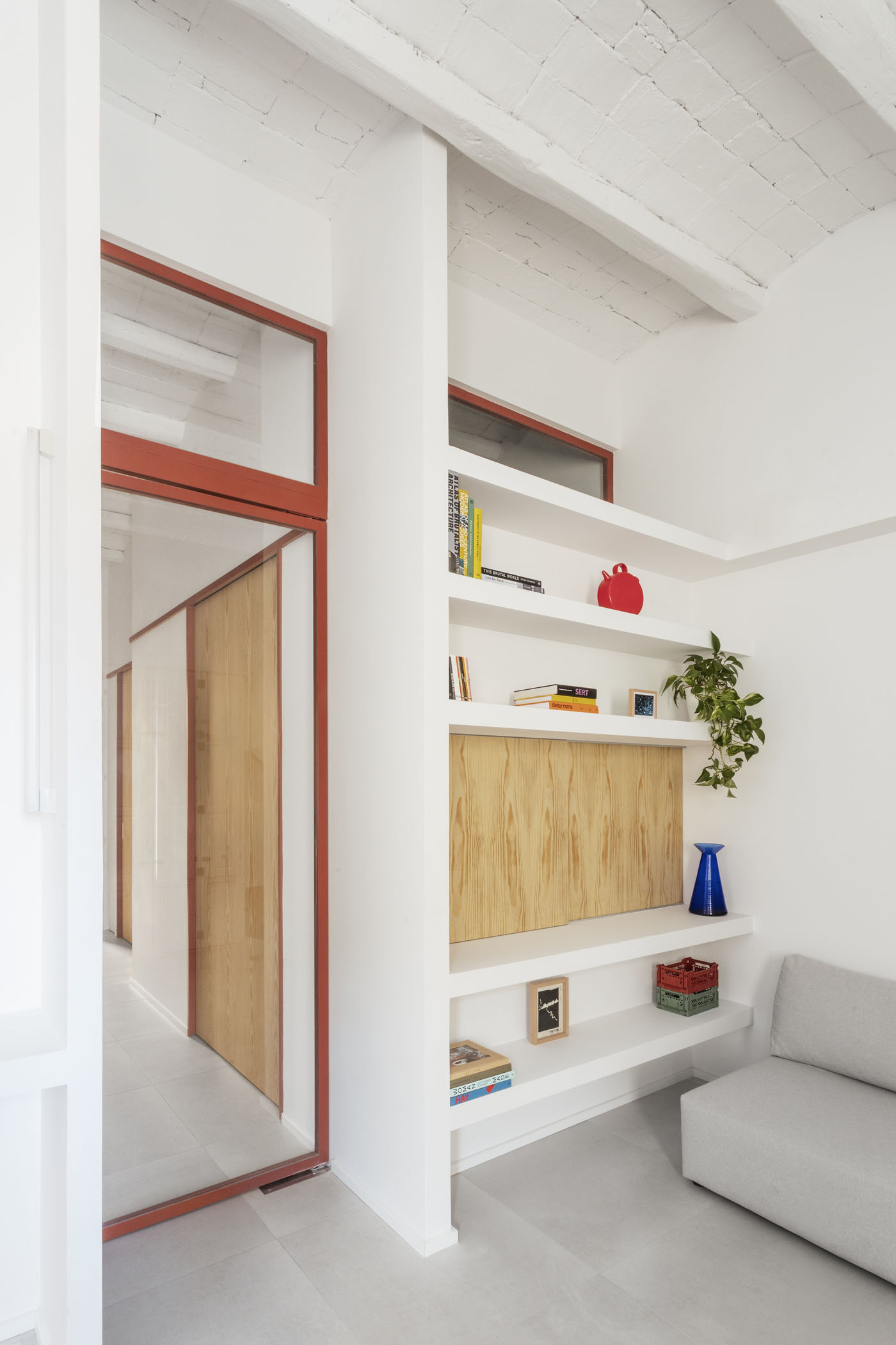ALT DE MARINER Reconversion of two old commercial premises located on the ground floor of a historical building with a beautiful courtyard into a new house by Horta neighborhood. The main objective of the project is to open up and communicate the spaces and give maximum light to the interior areas. The metallic carpentries and countertops in terracotta color, along with the sky-blue of some walls combined with the pine wood, give personality to this new home.