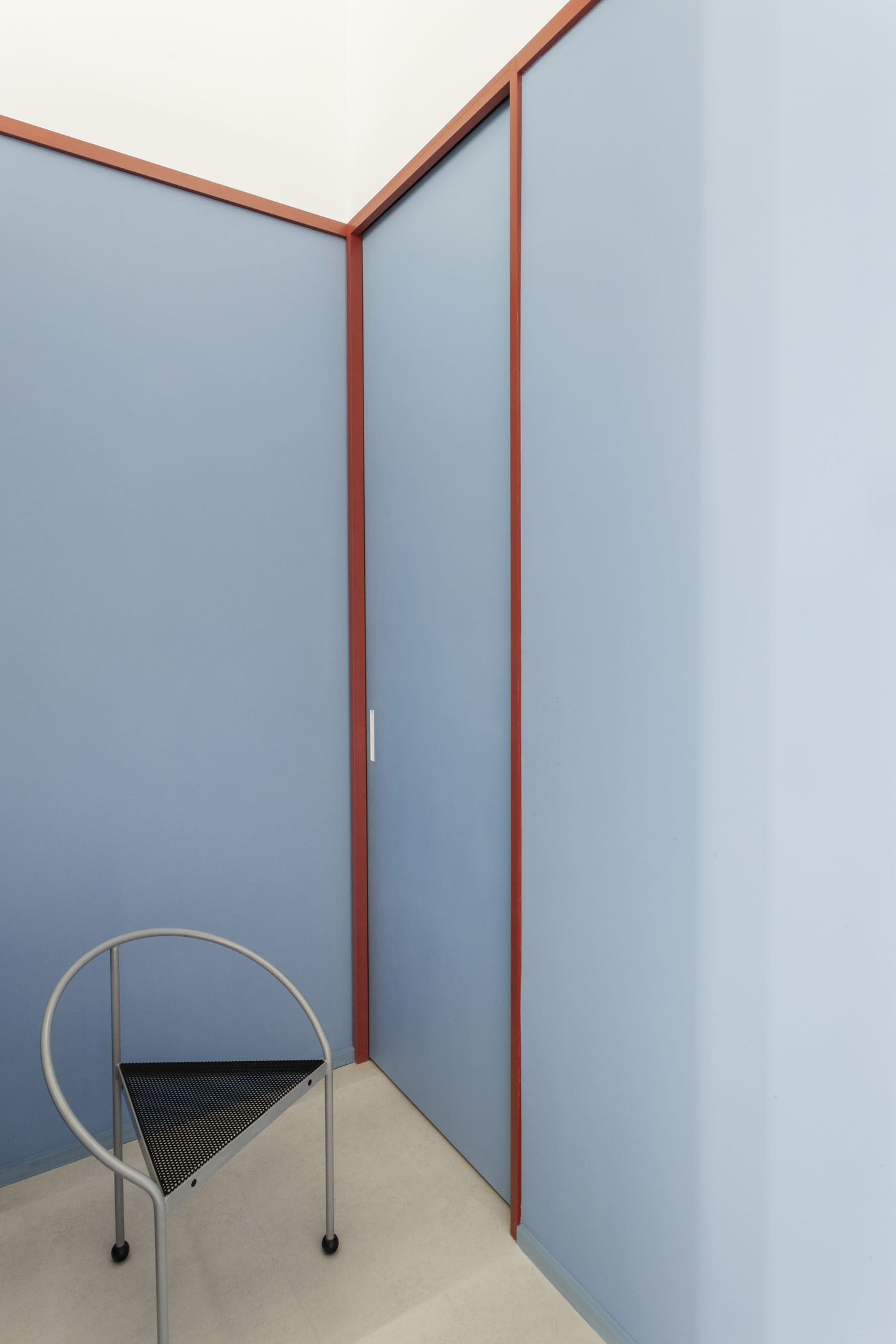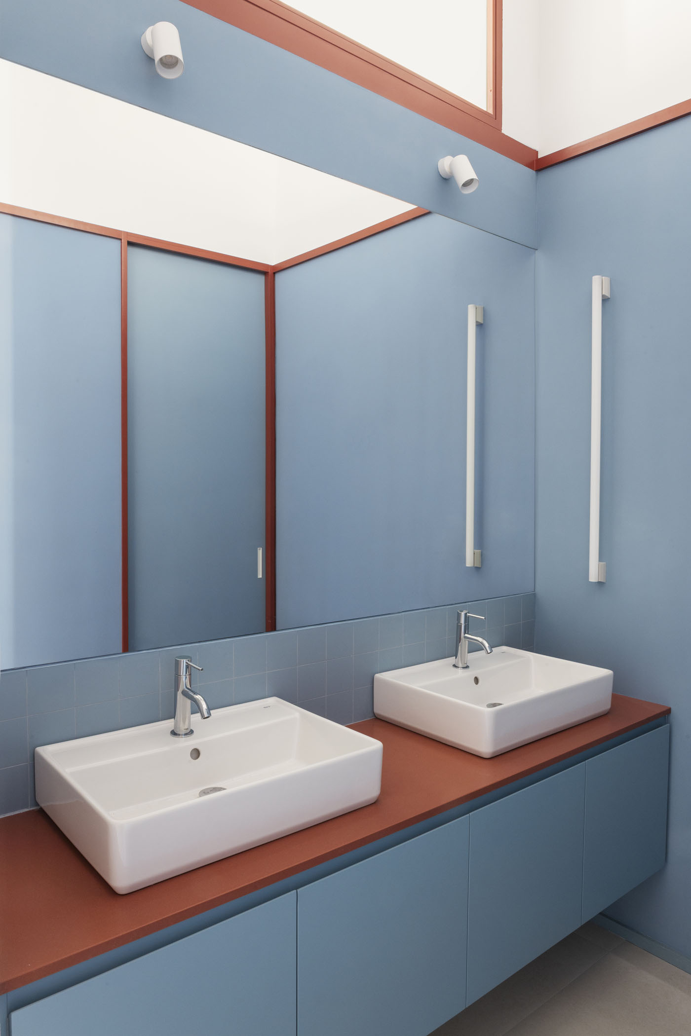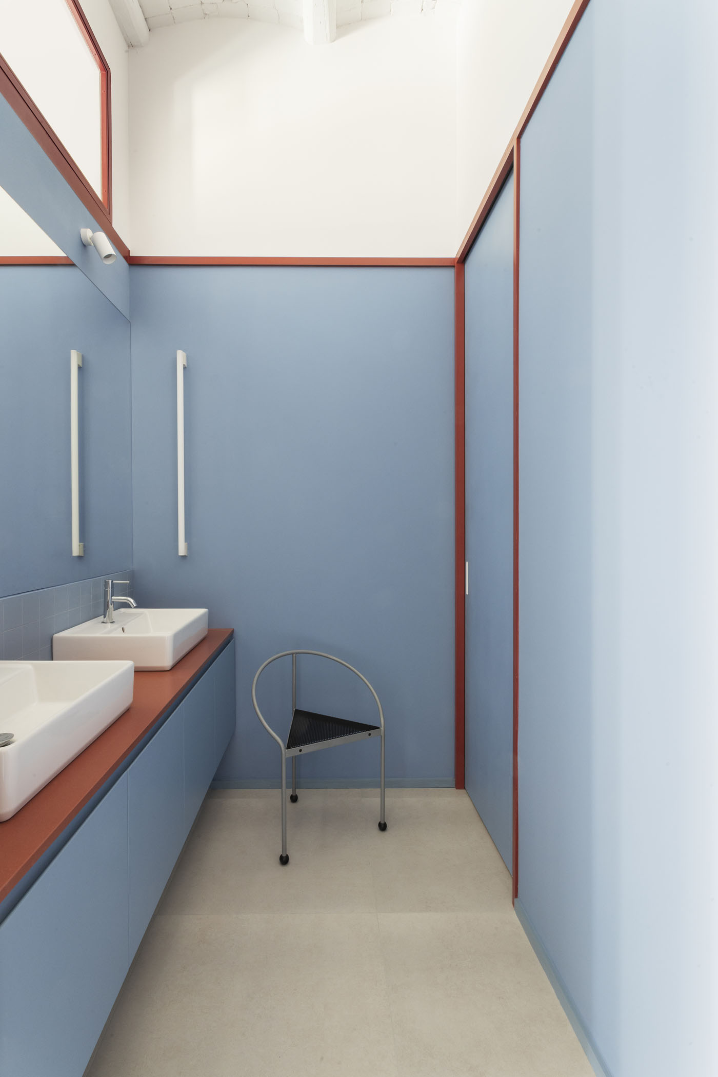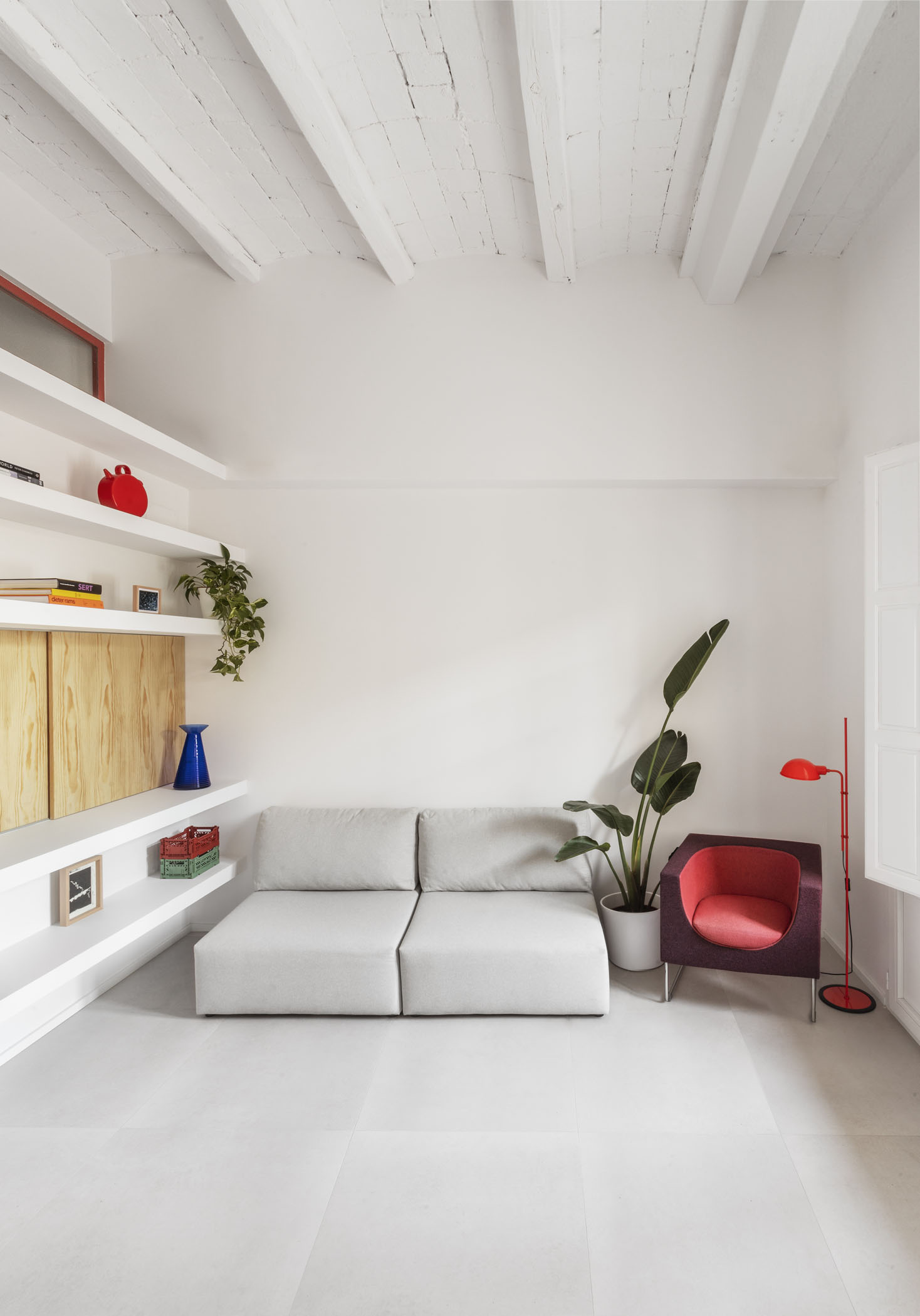 ALT DE MARINER Reconversion of two old commercial premises located on the ground floor of a historical building with a beautiful courtyard into a new house by Horta neighborhood. The main objective of the project is to open up and communicate the spaces and give maximum light to the interior areas. The metallic carpentries and countertops in terracotta color, along with the sky-blue of some walls combined with the pine wood, give personality to this new home.