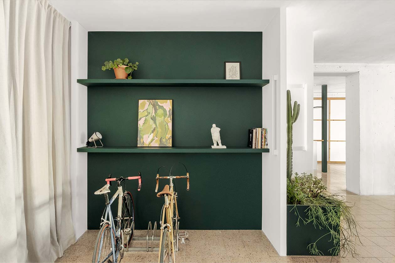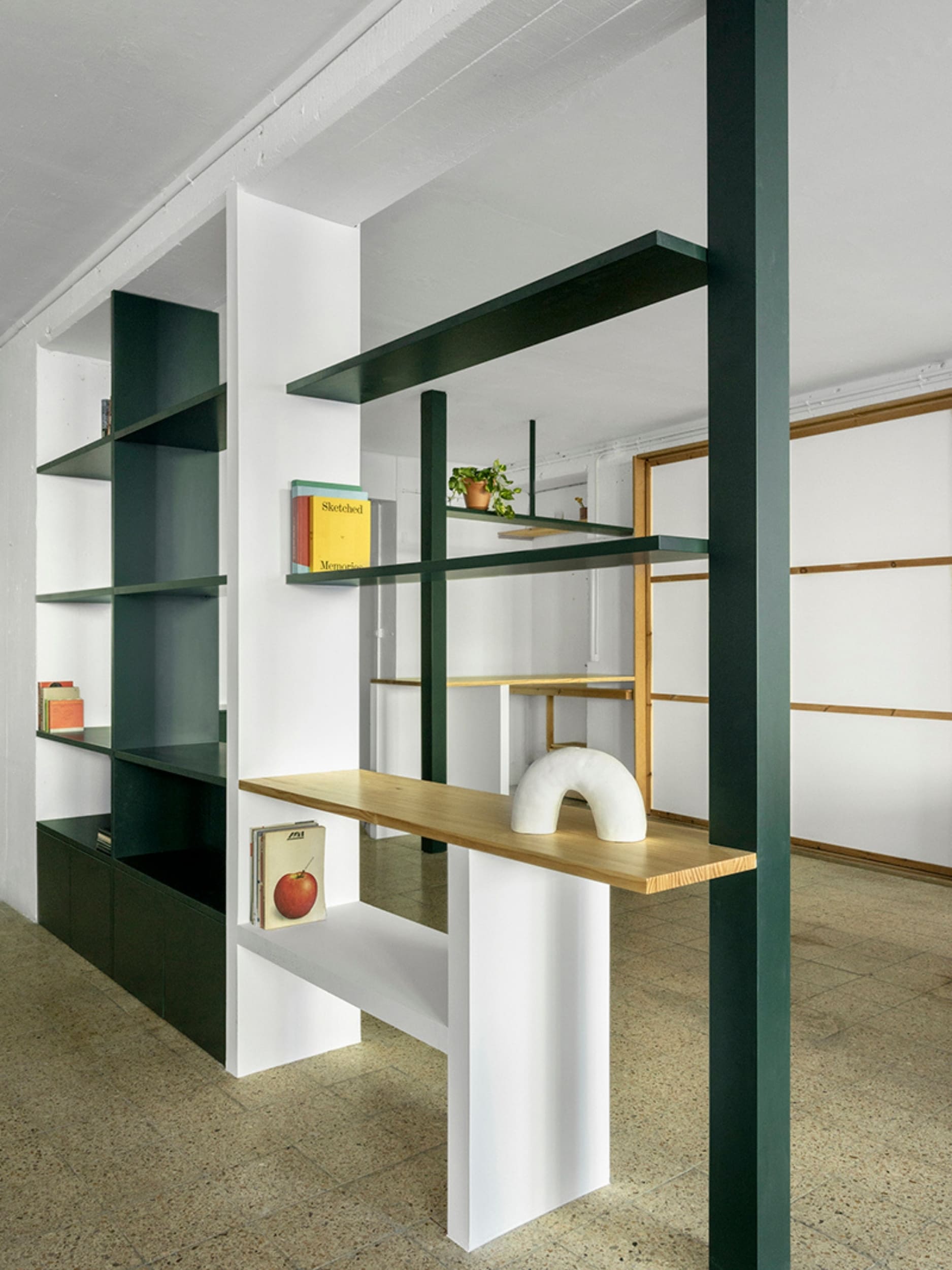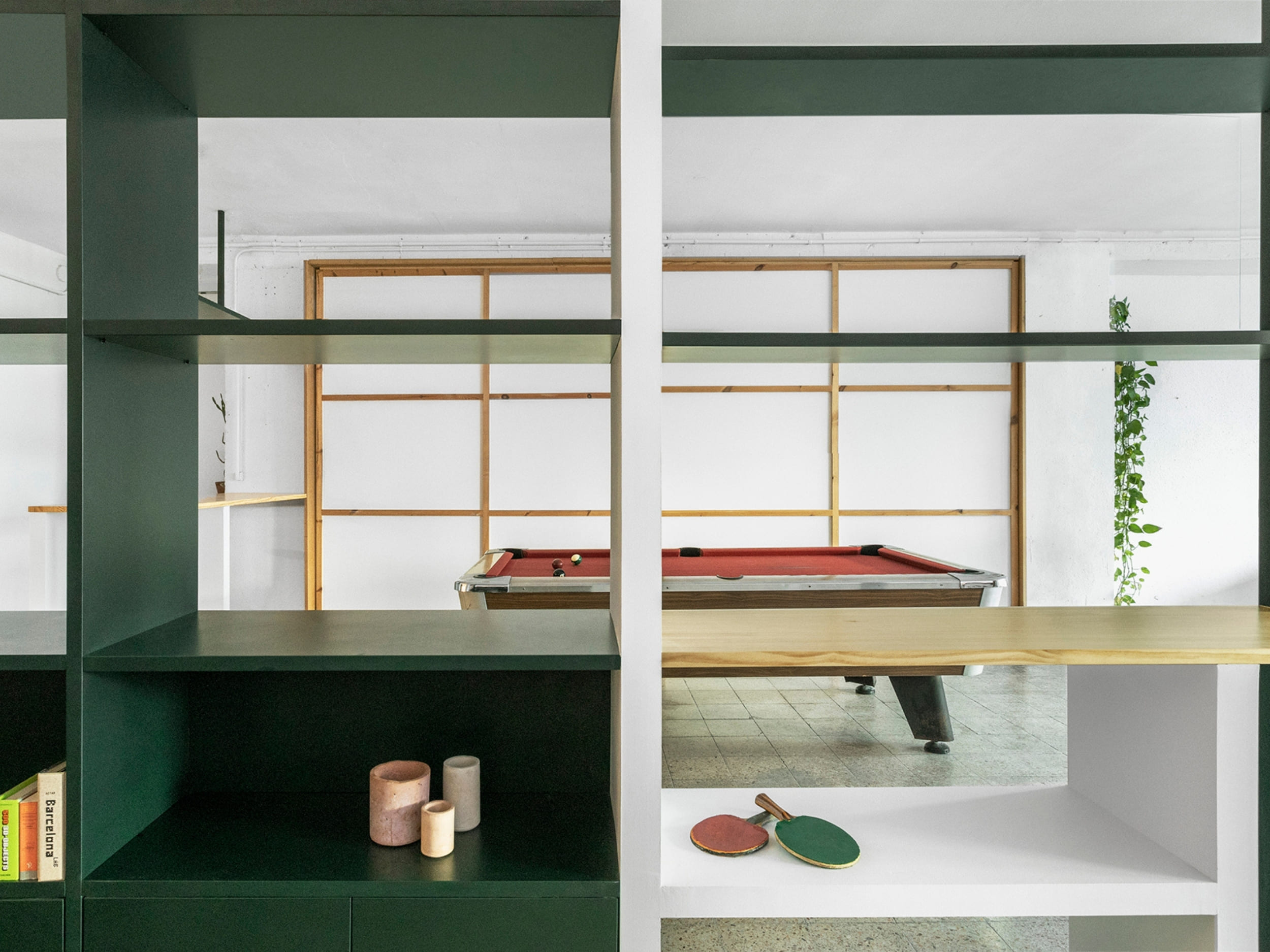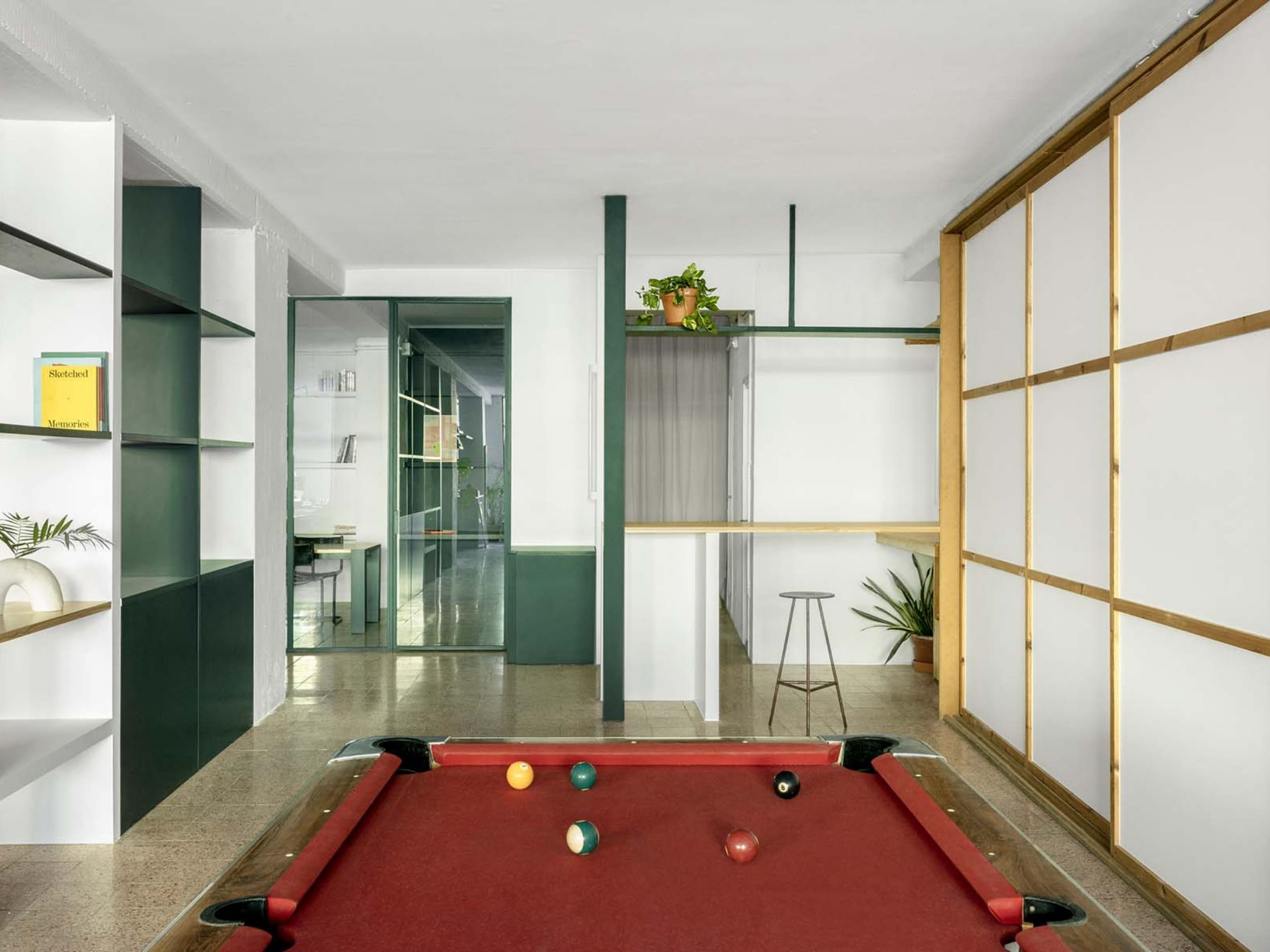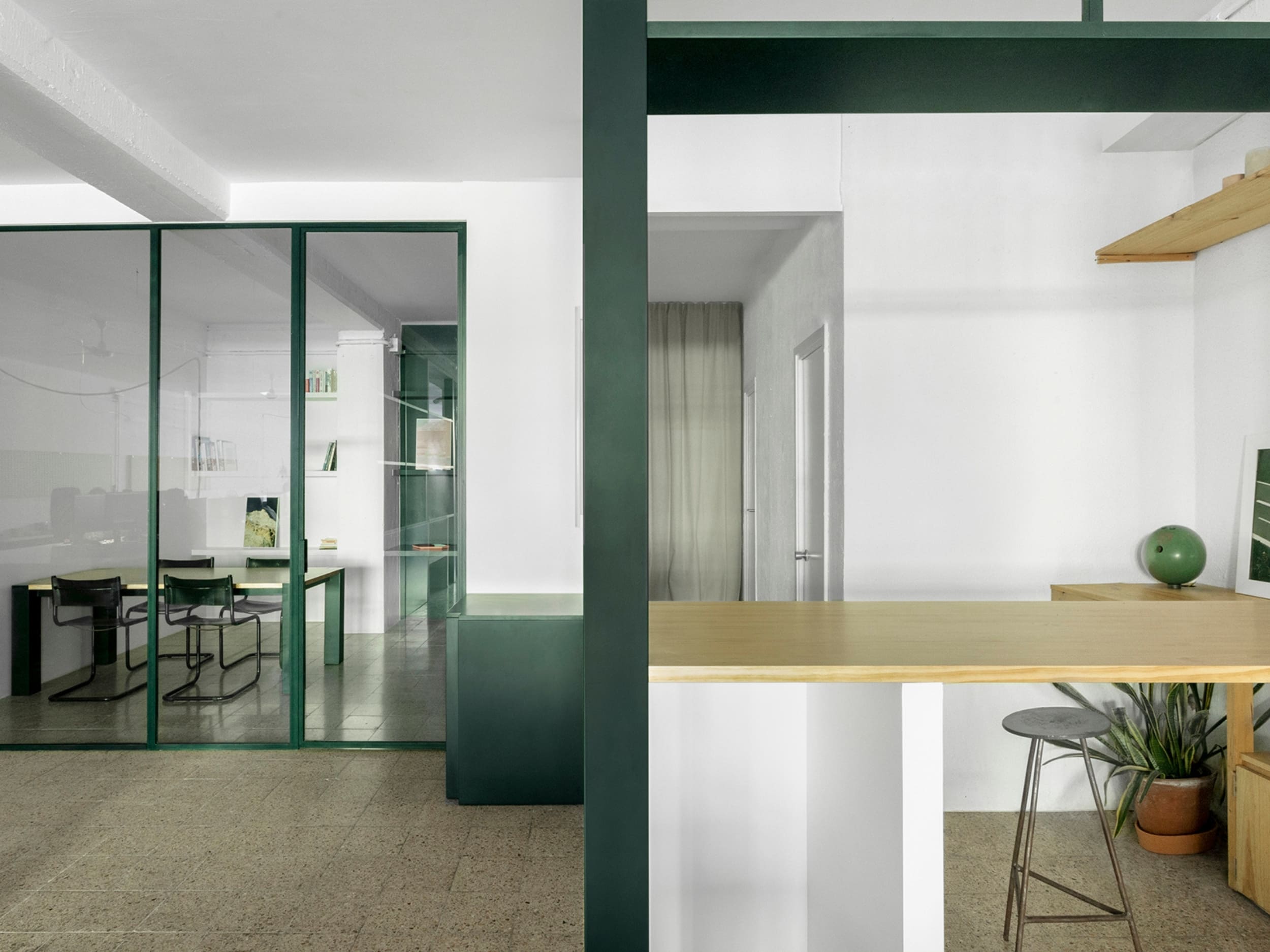 MARTES Office redistribution for the creative audiovisual company Martes Studio. This included the building of a new meeting room, together with an entrance hall and the design of different custom-made storage elements for the working space and some additional pieces for the break area. Solid elements in dark green, combined with pine wood boards, provide a distinct identity to the project.