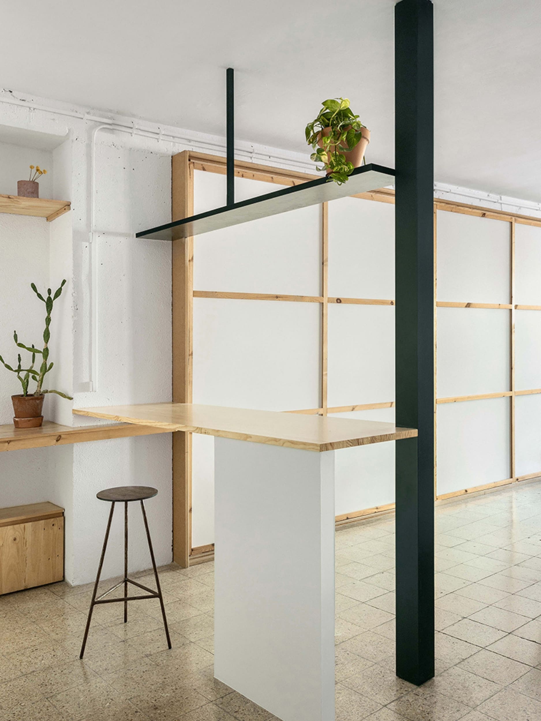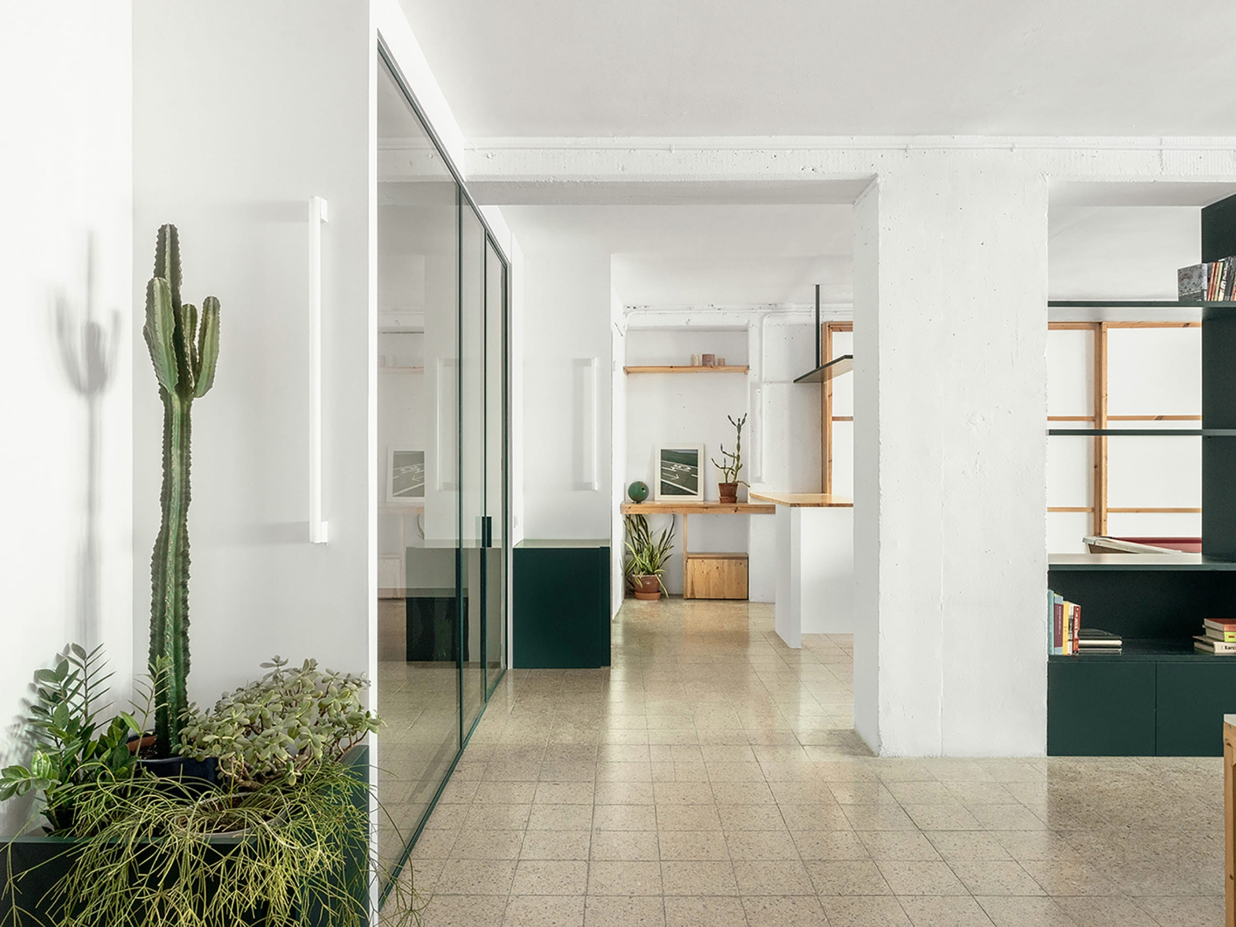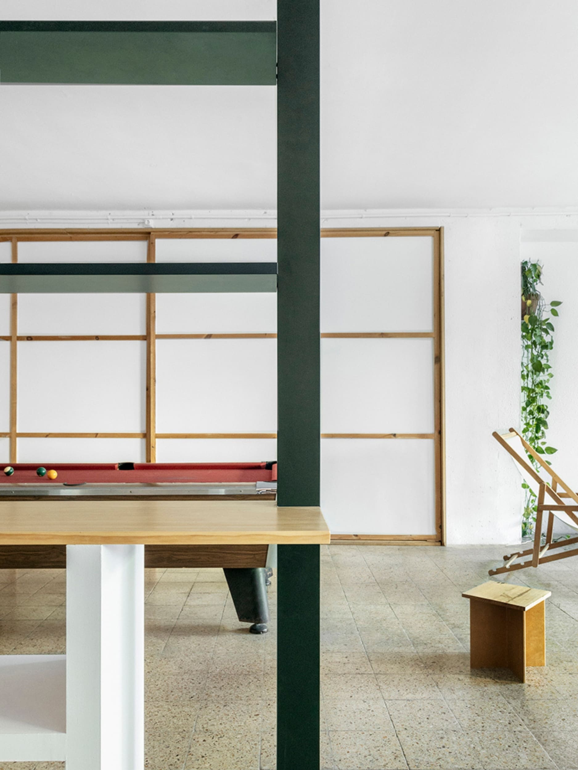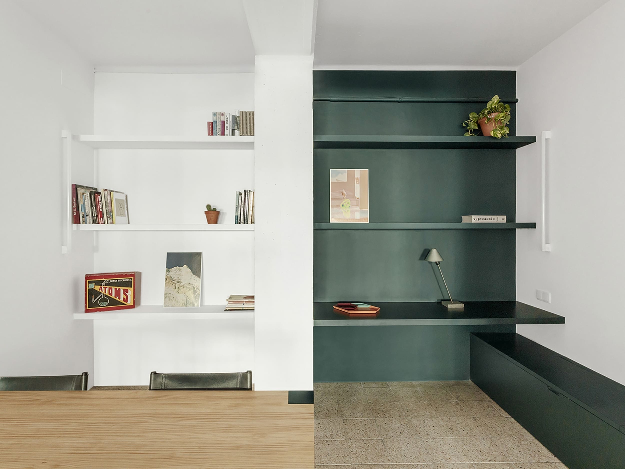 MARTES Office redistribution for the creative audiovisual company Martes Studio. This included the building of a new meeting room, together with an entrance hall and the design of different custom-made storage elements for the working space and some additional pieces for the break area. Solid elements in dark green, combined with pine wood boards, provide a distinct identity to the project.