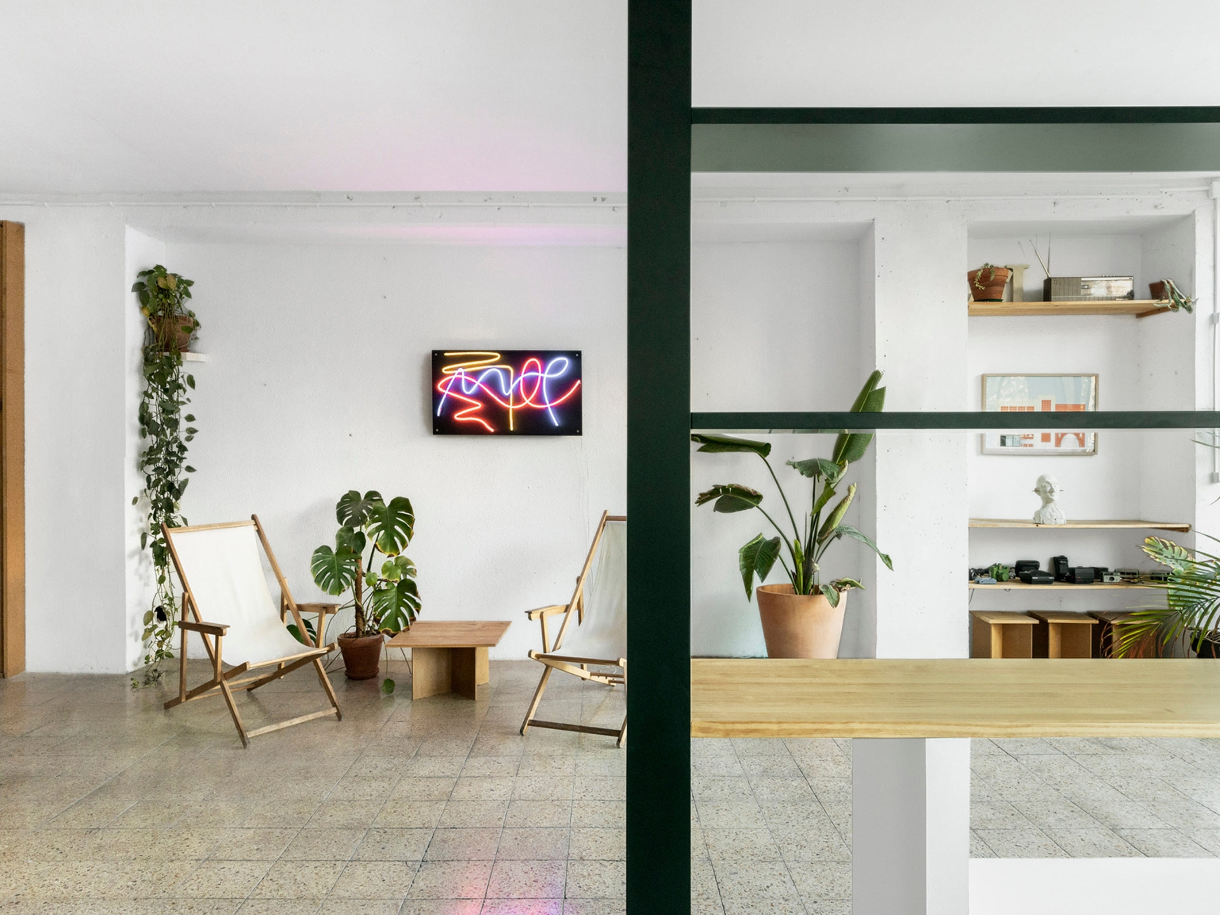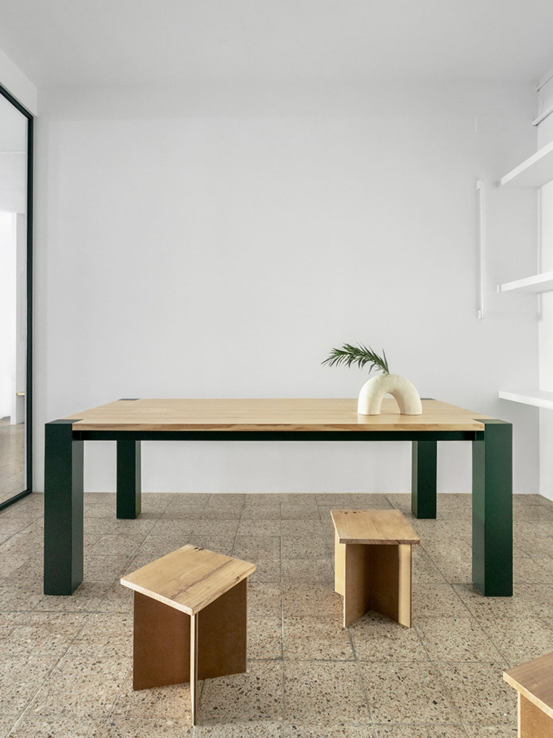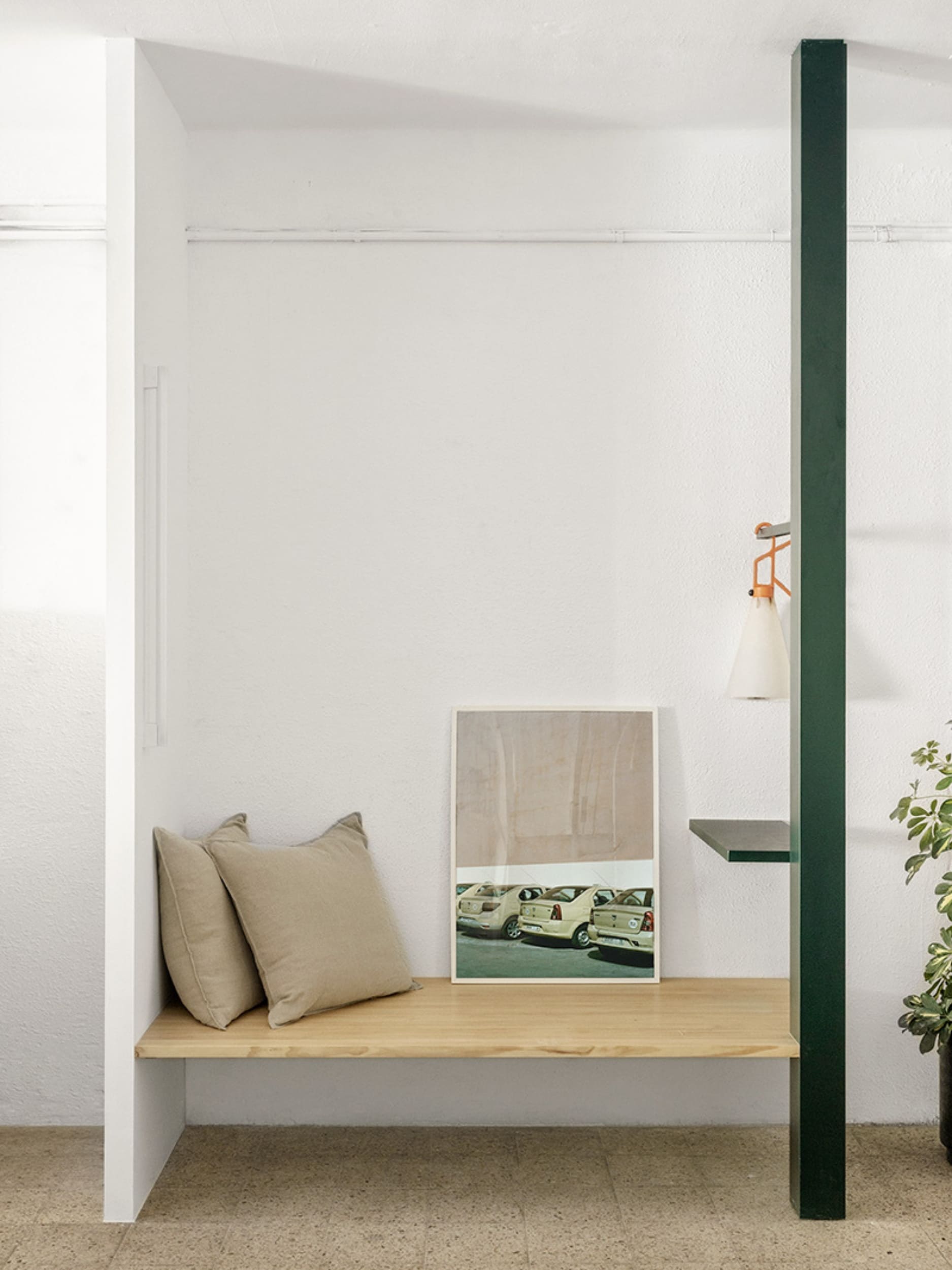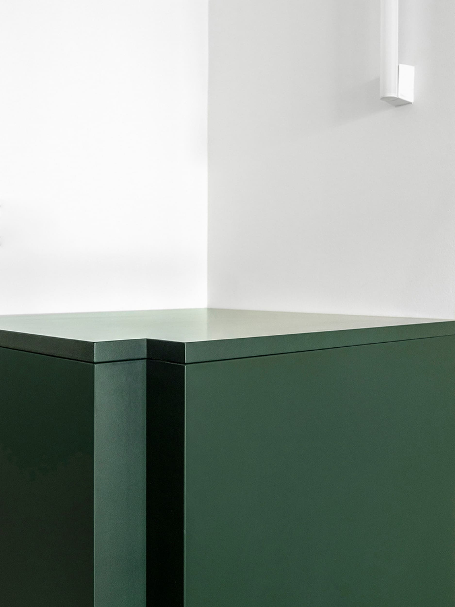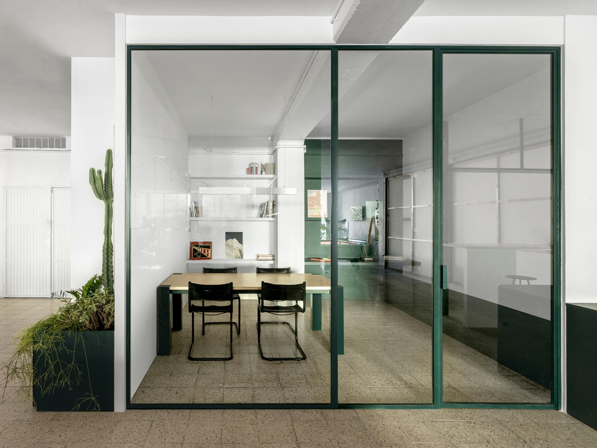 MARTES Office redistribution for the creative audiovisual company Martes Studio. This included the building of a new meeting room, together with an entrance hall and the design of different custom-made storage elements for the working space and some additional pieces for the break area. Solid elements in dark green, combined with pine wood boards, provide a distinct identity to the project.