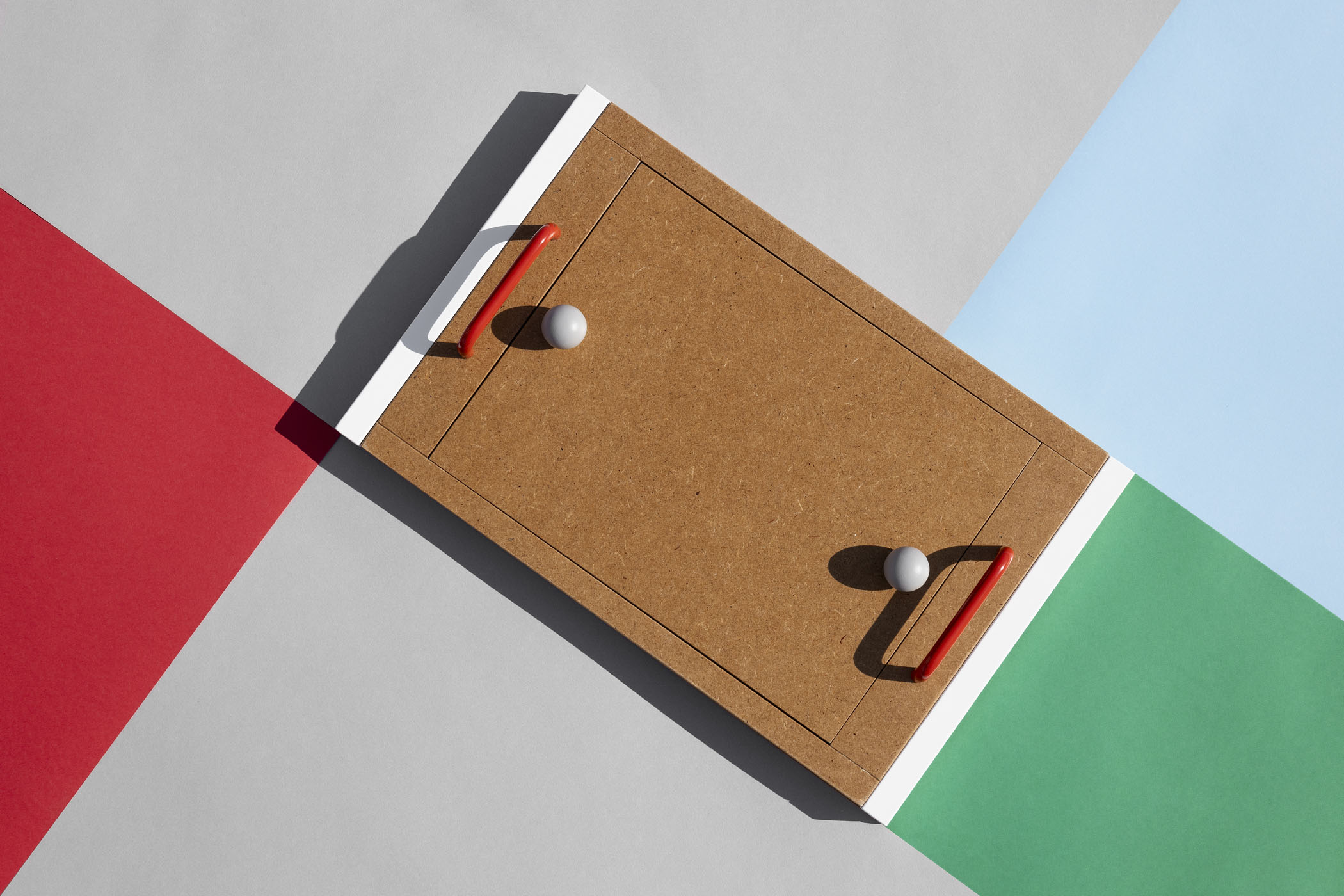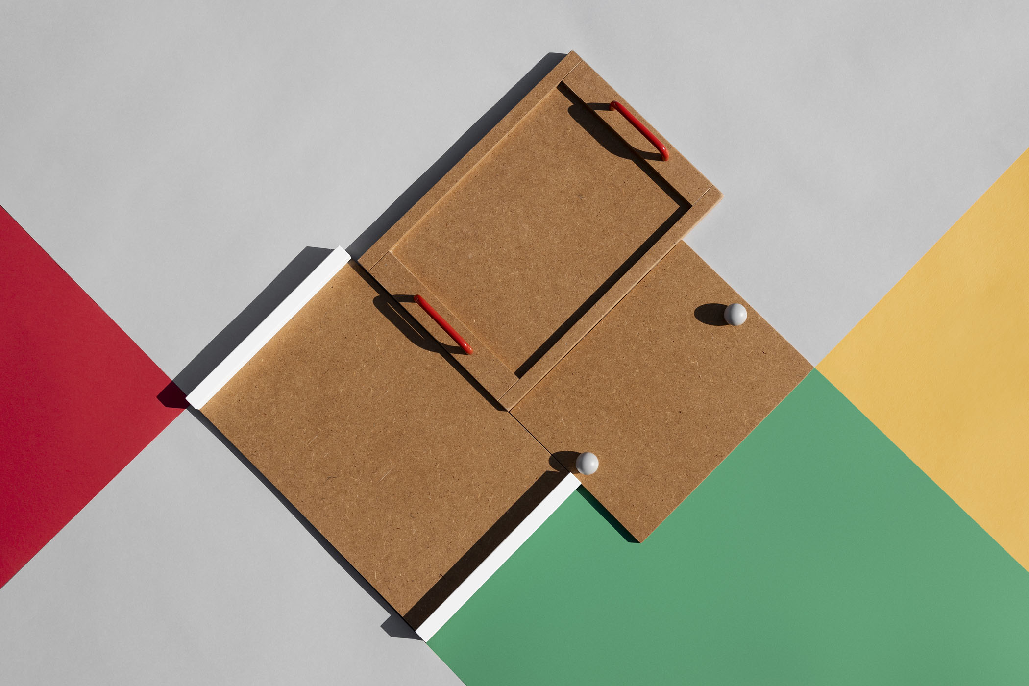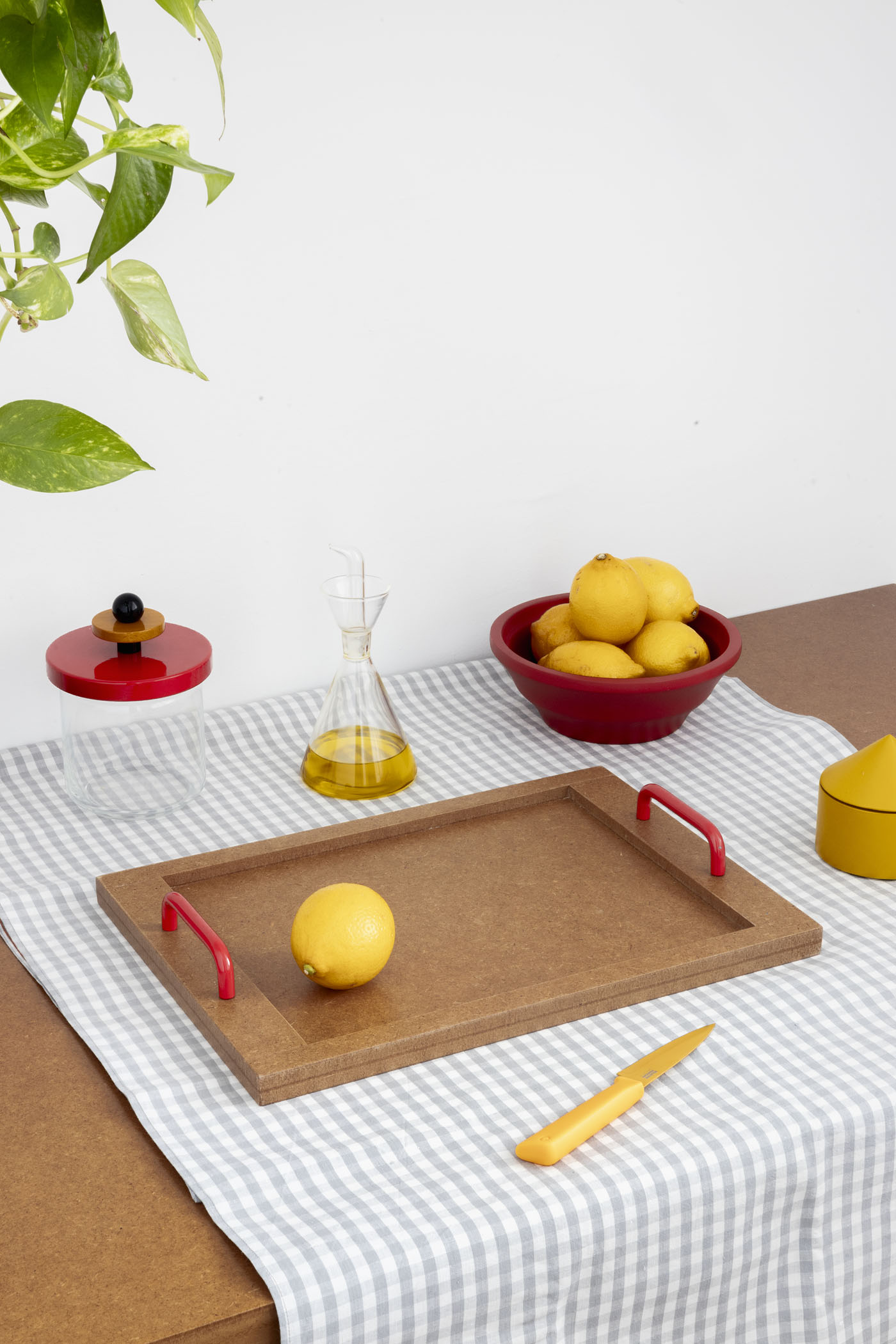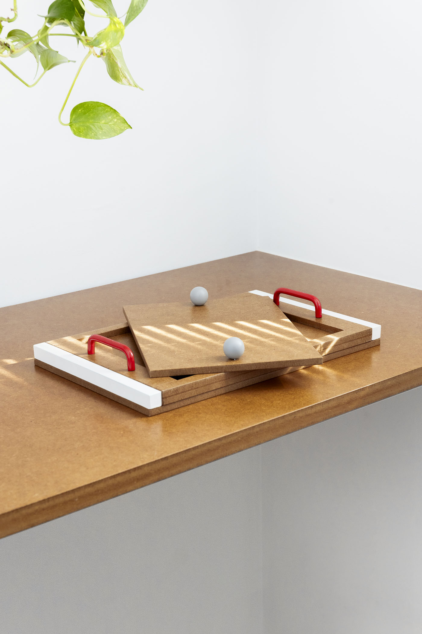 NIU tray Set of three multifunctional trays that fit one inside the other for easy storage. Its design of simple shapes with varnished mdf board and handles of different types and colors in each of them give singularity to the set.