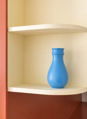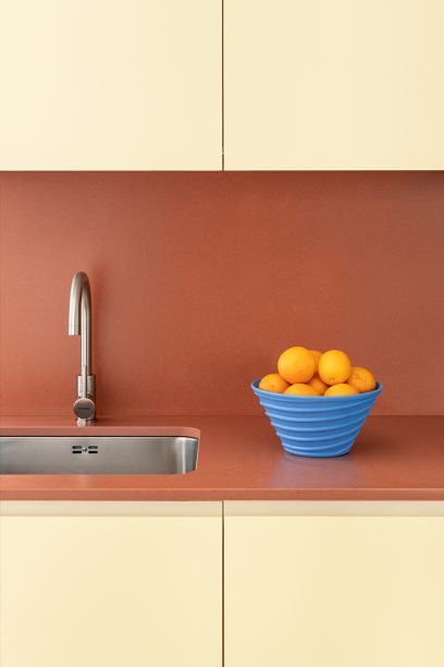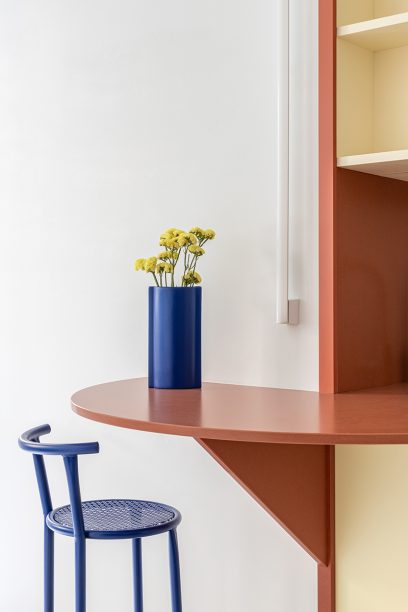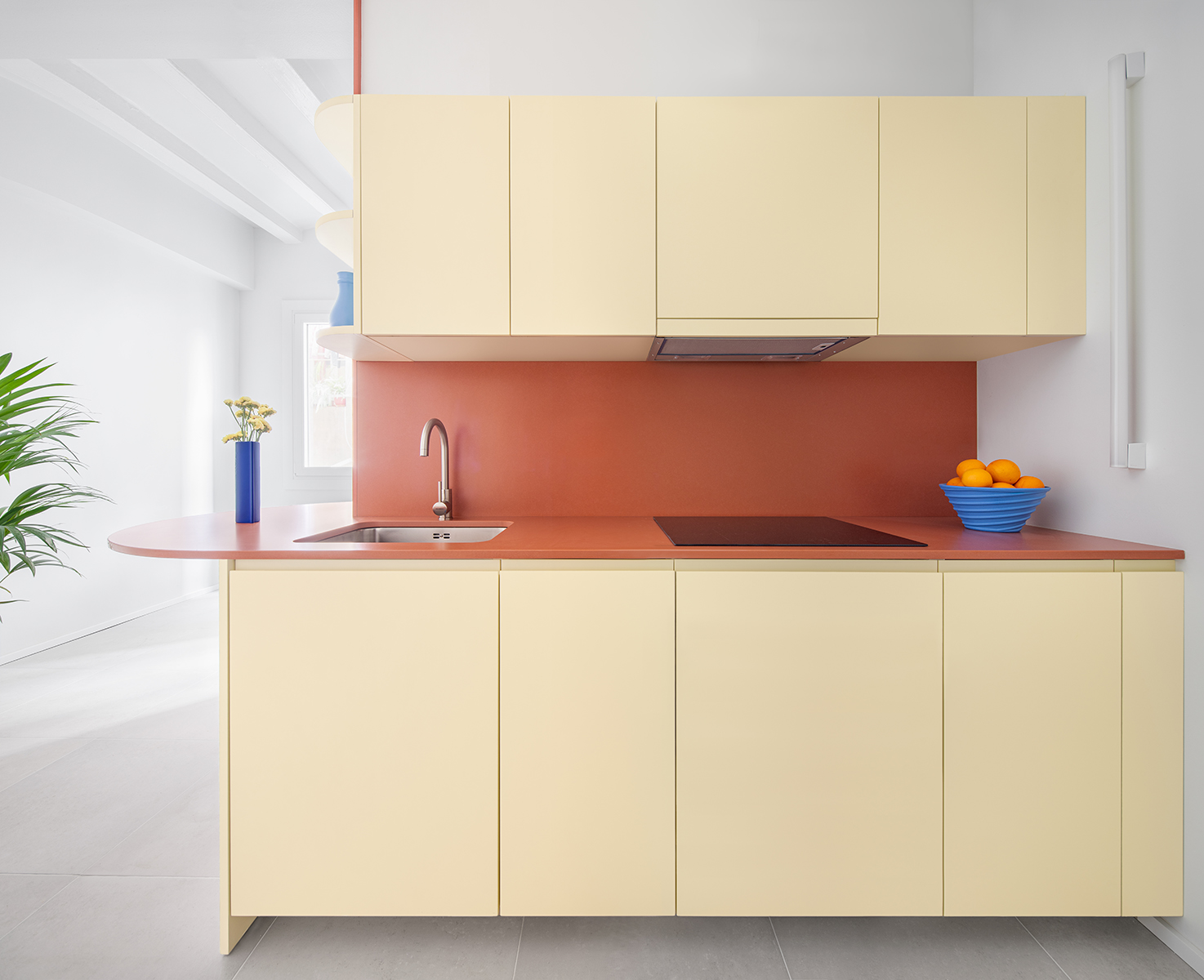 SANT ERASME Renovation of a small 38 m2 apartment in the historic centre of Barcelona. The kitchen becomes the central element of the project, extending to the living room through a semicircular countertop that works as a dining table. The terracotta countertop, in contrast to the soft yellow cabinets, gives singularity to this small but functional kitchen.
