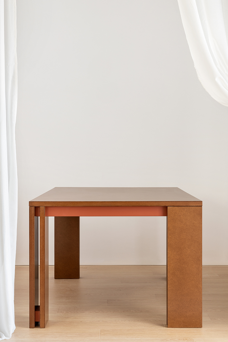 TEBU table Design of a dining table inspired by traditional Japanese interiors, aiming for a balanced mixture between a solid and delicate appearance, with mdf boards and a metallic perimeter structure.